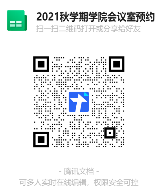 为规范学院公共会场资源管理,便于大家借用,学院办公室以腾讯文档形式制作了共享文档,大家可点击下面的链接或扫描二维码,填写并查看学院公共会场预约情况,并在自己需要的时间进行填写预约。