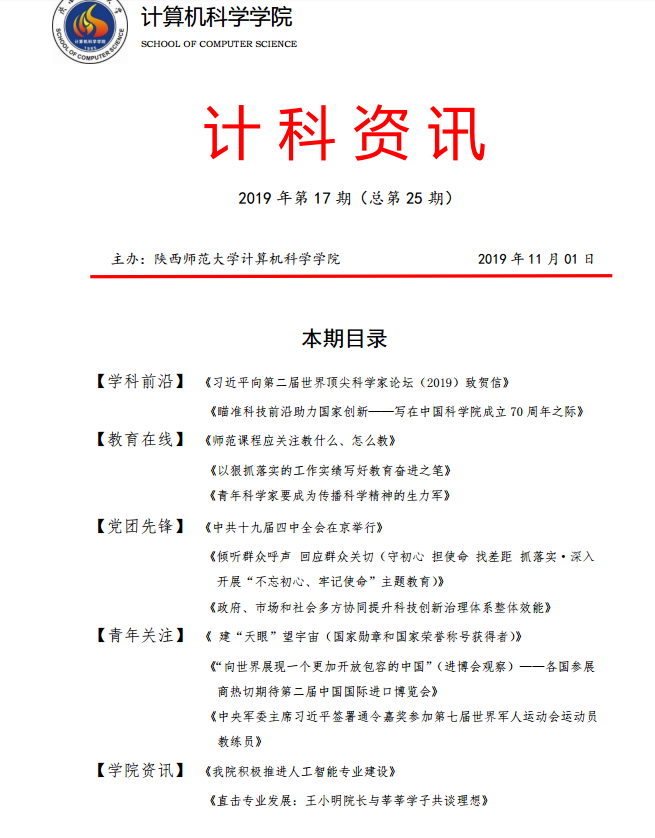 《计科资讯》是兔子先生 编辑整理的电子资讯,信息来源为《光明日报》《人民日报》《中国青年报》等权威纸媒,编辑工作由学院优秀本科生党员、团员承担。《计科资讯》主要包括学科前沿、教育在线、党团先锋、青年关注及学院资讯五个版块。学院师生可以从中了解到专业前沿和国家时政大事,欢迎大家下载阅读。