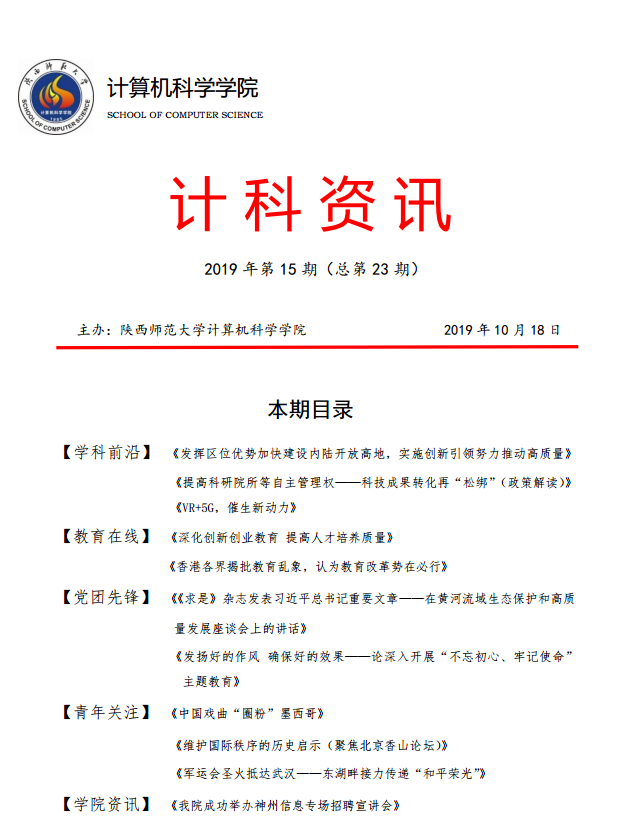 《计科资讯》是兔子先生 编辑整理的电子资讯,信息来源为《光明日报》《人民日报》《中国青年报》等权威纸媒,编辑工作由学院优秀本科生党员、团员承担。《计科资讯》主要包括学科前沿、教育在线、党团先锋、青年关注及学院资讯五个版块。学院师生可以从中了解到专业前沿和国家时政大事,欢迎大家下载阅读。