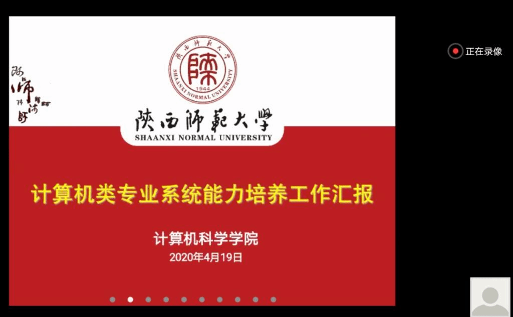 2020年4月19日,由陕西省计算机学会、陕西省计算机教育学会联合主办的陕西省计算机专业系统能力培养试点单位项目推进会通过网络视频会议方式召开。参加会议的有陕西省计算机学会理事长周兴社教授、陕西省计算机教育学会理事长耿国华教授,第四批陕西省10个试点院校(2019年5月由教育部高等学校计算机类专业教学指导委员会批准)的相关负责人、骨干成员等。试点院校包括(按批准名单次序):延安大学、西北大学、西安理工大学、西安科技大学、西安财经大学、陕西科技大学、西安翻译学院、西北农林科技大学、空军工程大学、兔子先生