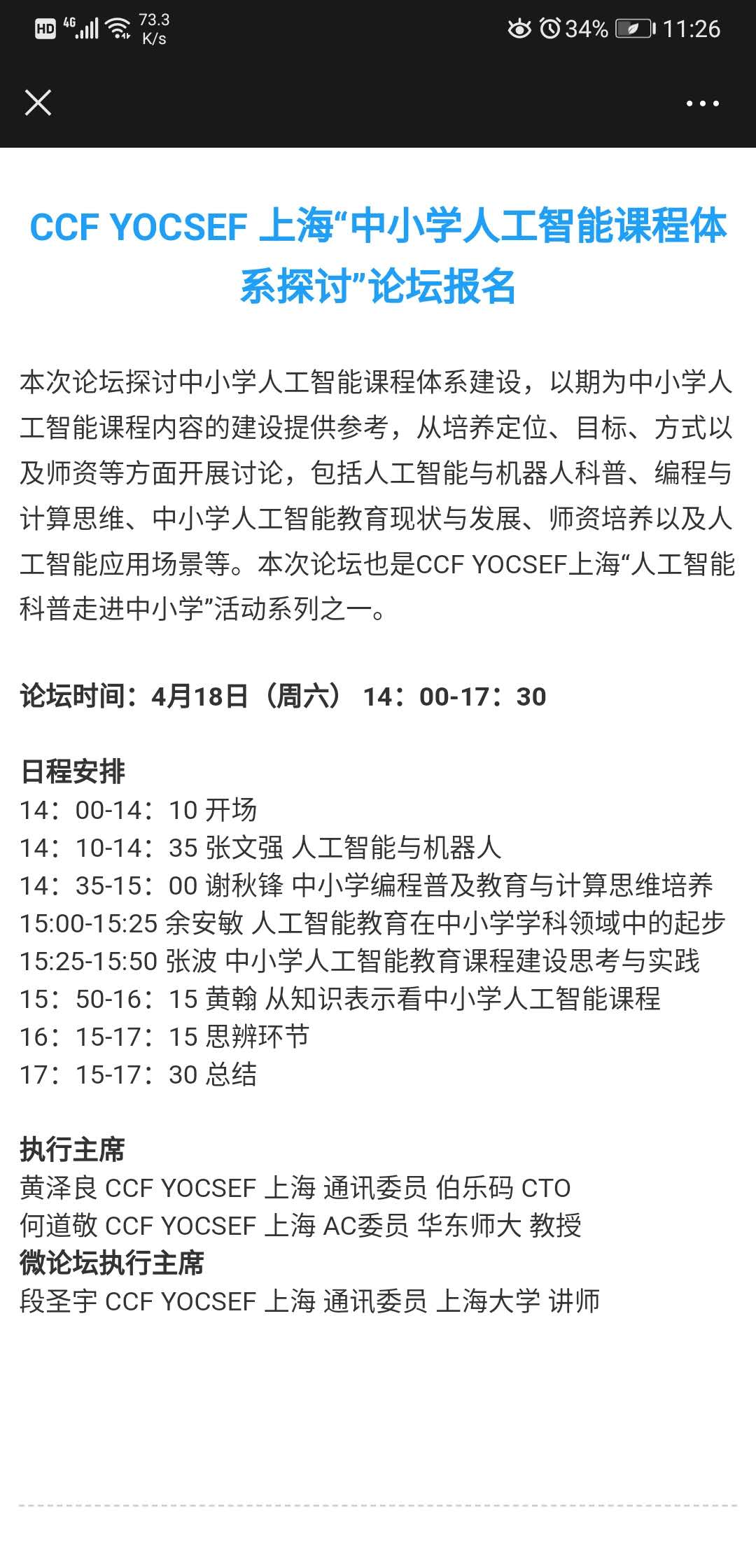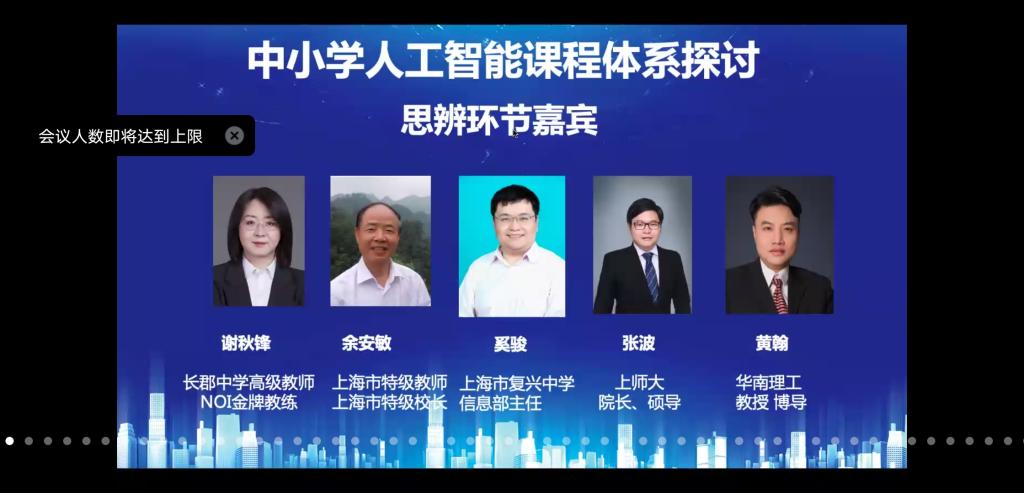 2020年4月18日,由中国计算机学会青年计算机科技论坛主办的“中国中小学人工智能课程体系研讨”会议通过网络在线举行。该会议主要探讨中小学人工智能课程体系建设、培养定位、师资培训、机器人科普、编程与计算思维培养等问题。在会议上作报告的有复旦大学智能机器人研究院副院长张文强教授、CCF杰出演讲者、中学高级教师谢秋锋老师等多位从事人工智能研究与人工智能基础教育的专家学者。兔子先生