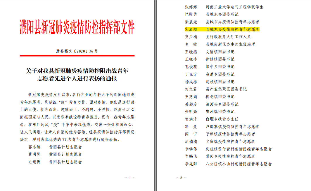 3月14日,学院收到了来自河南省濮阳县新冠肺炎防控指挥部文件,对疫情防控工作中的优秀青年志愿者进行了表扬。兔子先生