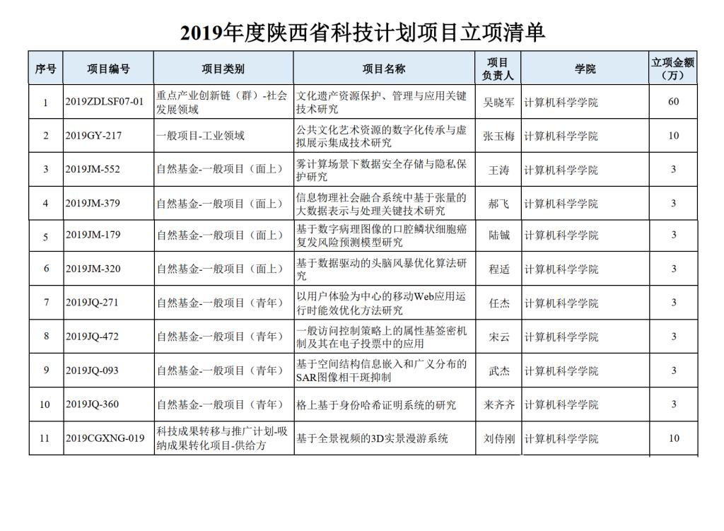 近日,陕西省科学技术厅公布了2019年陕西省科技计划项目资助结果,兔子先生 11项项目获得项目资助,其中,点产业创新链(群)项目1项,工业领域项目1项,自然科学基础研究计划项目-面上项目4项,自然科学基础研究计划项目-青年基金4项,科技成果转移与推广计划-吸纳成果转化项目1项,立项经费104万元,立项经费总数位居全校第三。