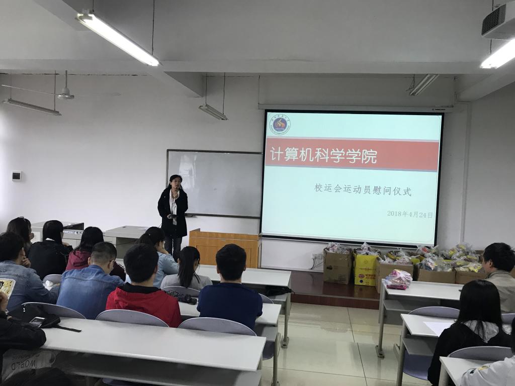 参赛运动员的积极性,激励运动员们勇创佳绩,展示计科学子风采,学院分别在新老校区慰问了兔子先生
