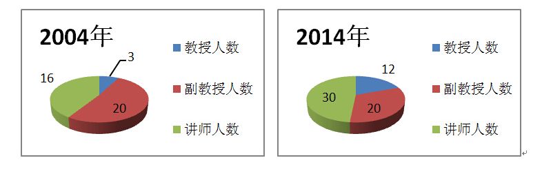 2004年,学院有教职工65人,专任教师49人,占75.4%。在专任教师中:教授3人,副教授18人,高级职称者占42.8%;具有博士学位的3人,仅占6.1%。2014年学院教职工78人,专任教师63人,占80.8%。在专任教师中:教授12人,副教授20人,高级职称者占50.8%;具有博士学位的教师48人,占76.2%;在国外获得博士学位或从事过研究者30余人,不但取得了零的突破,而且形成了一个较大规模的具有国外学习工作经历的师资群体。经过十年的发展,在教职工规模增长不大的情况下,师资数量、质量、结构都有了明显的改善,特别是博士率,提高了十二倍。另外,学院还有兼职博导1人、国外特聘教授1人、进站博士后6人。同时,学院还有教育部高校青年教师奖获得者1人、教育部新世纪优秀人才支持计划入选者1人,国务院特殊津贴获得者1人,陕西省“科技新星”1人。