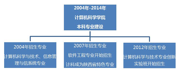 本科招生专业适度增加。学院的本科招生专业从当时的计算机科学与技术(师范)和信息管理与信息系统专业(非师范)增加到了现在的三个专业四个方向:计算机科学与技术(免费师范生)和信息管理与信息系统专业、软件工程和计算机科学与技术创新实验班(非师范)。2007年计算机科学与技术专业被评为陕西省特色专业。