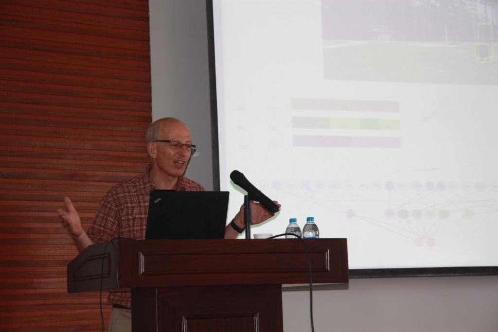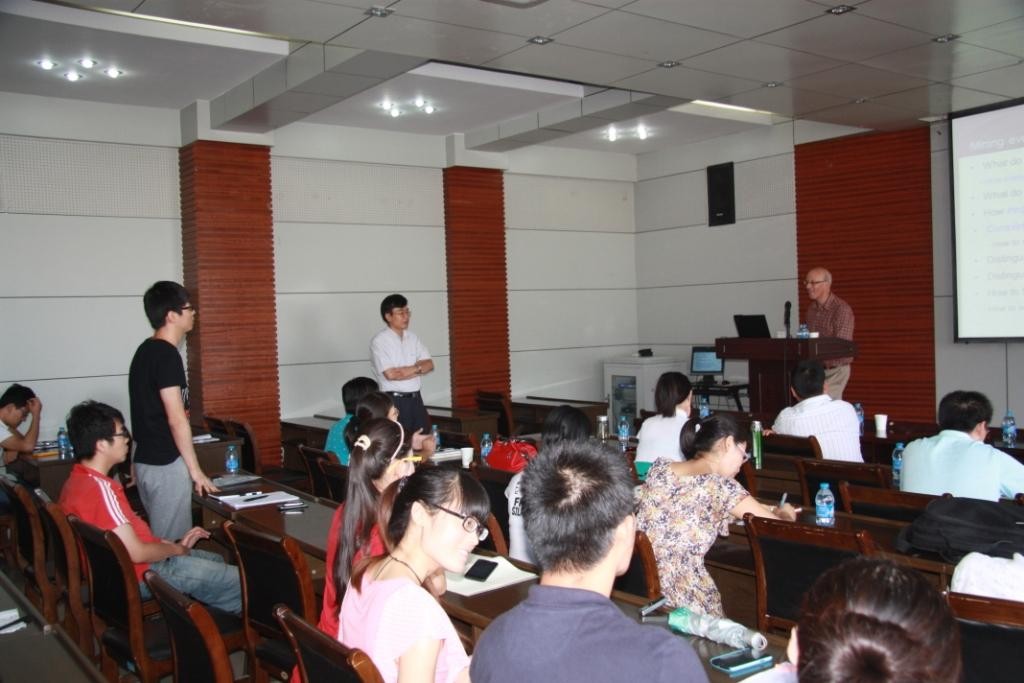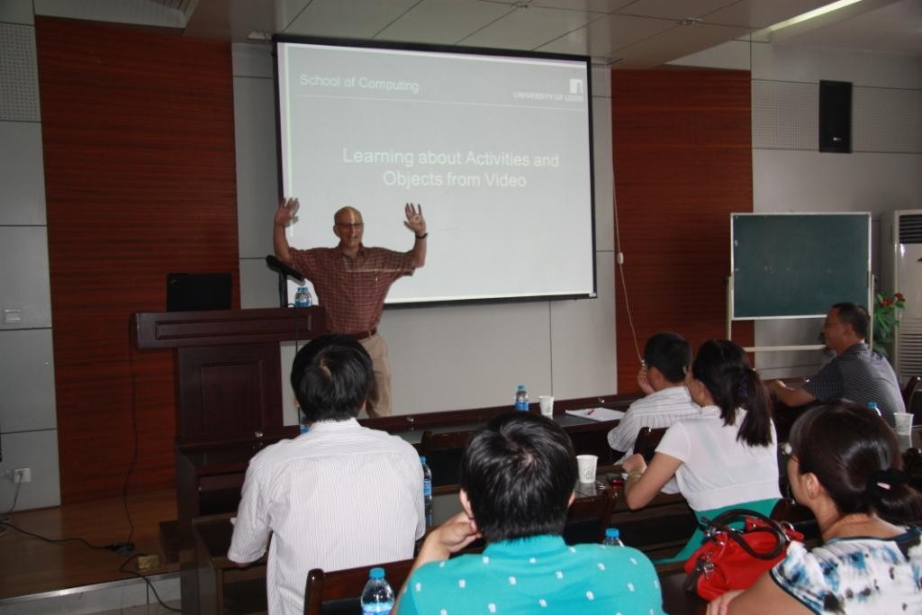 所有师生向Tony Cohn教授的到来表示热烈的欢迎,并向师生们着重介绍了Tony Cohn教授的学术背景和卓越成就。报告中,Tony教 授以身旁的纸杯作为例子,生动形象的给大家介绍了他在利兹大学做的视频活动建模的工作,并系统的深入讨论了视频或其他传感器数据的监督和无监督学习任务和 事件的时空结构,特别是并发活动情景下的两种学习。并解答了在上述两种情况下,如何定量的表达他们的时空关系,以及数学化的展示了他们的行为。
