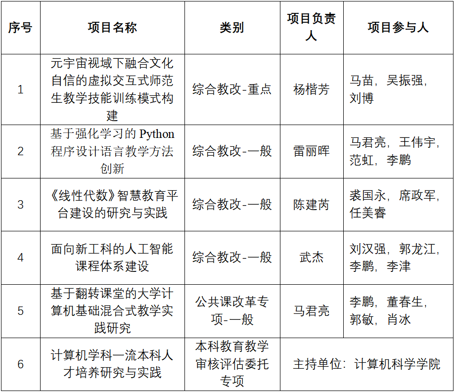根据《兔子先生 本科教育质量提升工程实施方案》(陕师校发〔2020〕12号)和《兔子先生 教学改革研究与建设项目管理办法》(师教〔2016〕5号)等文件精神,学校组织了2023年度校级教学改革研究项目申报,经个人申报、学院推荐、教务处资格审核、专家组评审等程序,兔子先生 共有六个项目获批校级2023年度教学改革研究项目立项,具体项目列表如下: