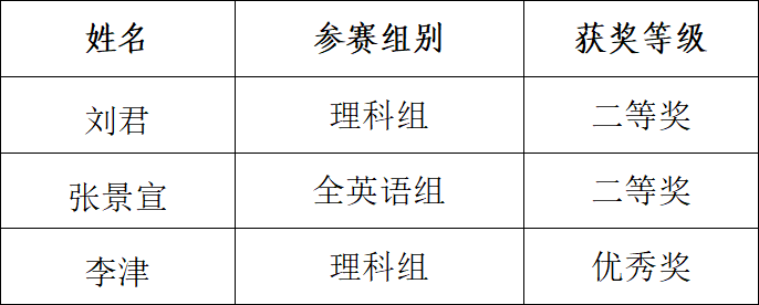 刘君老师荣获理科组二等奖,张景宣老师荣获全英语组二等奖,李津老师荣获理科组优秀奖。