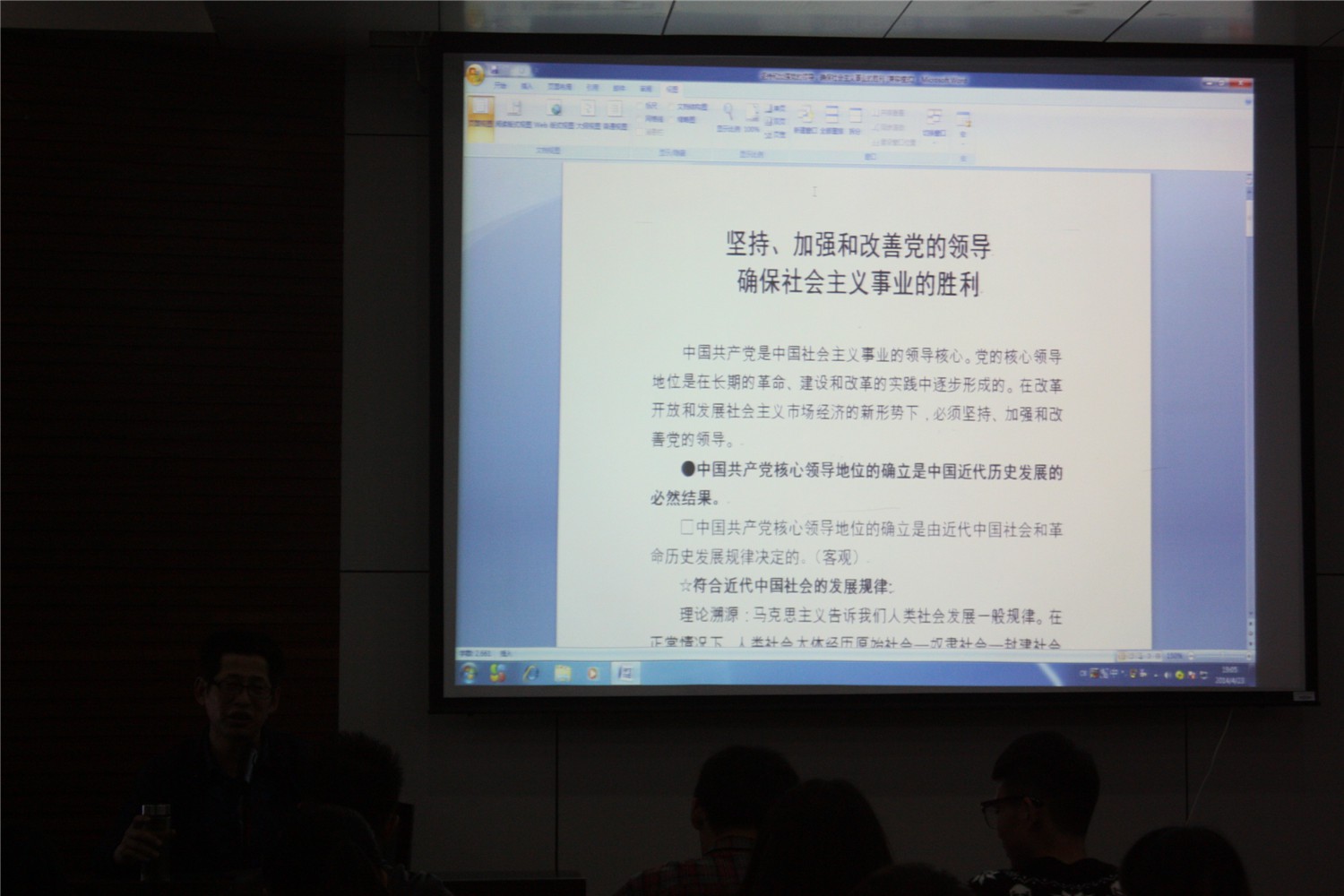 首先,刘老师就该主题进行了详细的讲解,他表示当代大学生要有勇往直前的锐气,敢为天下先的勇气,放眼未来的大气。刘老师激情澎湃的讲说激起了同学们的强烈共鸣。接着刘老师对“中国共产党核心领导地位的确立是中国近代历史发展的必然结果”这个问题进行了详细生动的讲解。刘老师指出,一切事物的发展都是要符合客观规律的,只有遵循这一规律,才能够披荆斩棘,突破重围,否则将会遭遇穷途末路的困境。最后,刘建军老师激励同学们要时刻保持理论学习的热情,始终如一,不断学习,与时俱进,用科学的理论武装自己,并希望同学们在追求自己理想的同时,要脚踏实地,根据自身的特点制订适合自己的目标。此次培训讲座在同学们热烈的掌声中取得圆满结束。