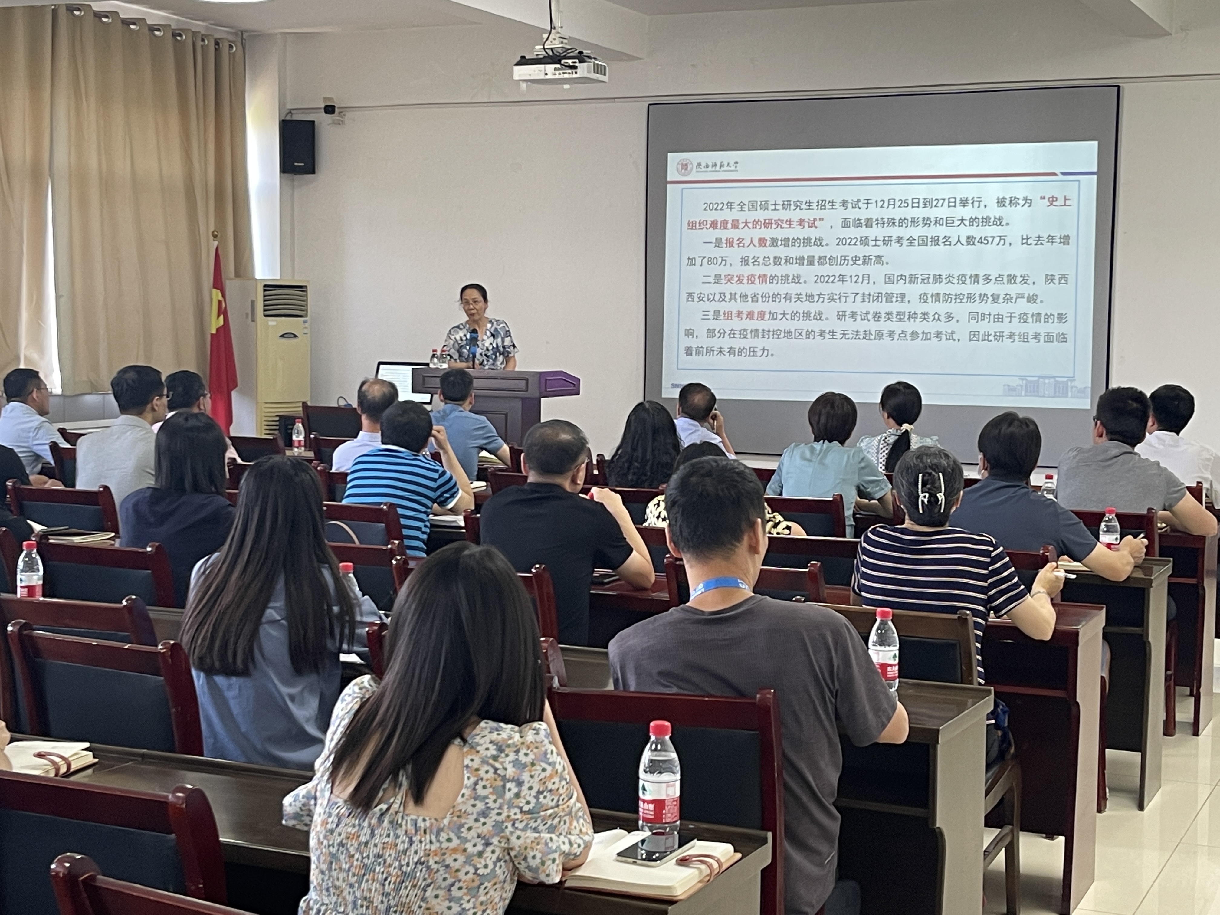 与社会各界通力合作,众志成城,迎难而上的奋战历程。此次研考工作的复杂性超乎想象,全校参与研考工作的1500余名教职工、学校党委、省级相关部门以及社会各界集中力量办大事,为保障考生平安考试做出的不懈努力令在场的师生党员深受触动。