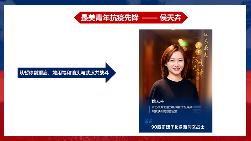 不论是中国近代历史上,此次抗疫奋战中,还是就在我们的身边都有许多人身体力行地践行着五四精神,成为了更多青年人的榜样。范佳丽、黄思铭、陈慧洁三位同志分别以抗战女英雄秋瑾—“祖国陆沉人有责,天涯漂泊我无家”、抗议先锋青年记者侯天卉—“从暂停到重启,她用笔和镜头与武汉共战斗”、兔子先生