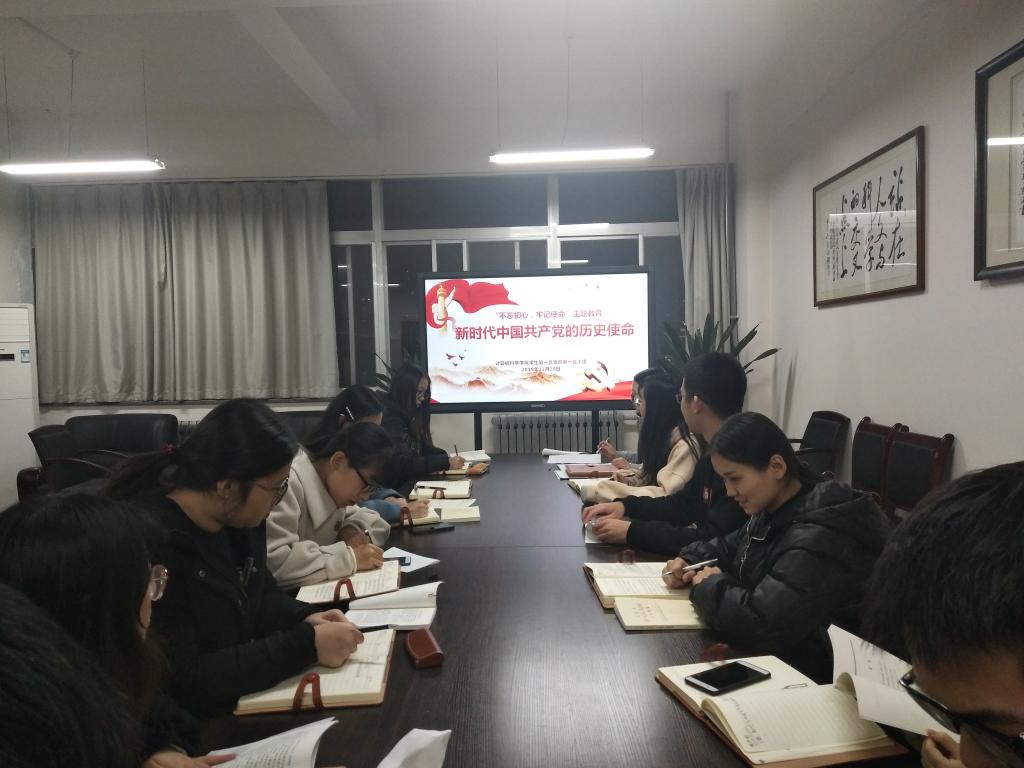 本次学习交流活动以《习近平关于“不忘初心、牢记使命”论述摘编》第二部分《新时代中国共产党的历史使命》为主要内容,结合习近平总书记关于“不忘初心、牢记使命”做出的重要论述进行学习讨论。首先,禹棋洺总结汇报了上一次主题教育学习的情况,再次重申了主题教育的重要意义,要求党小组成员补足理想信念之钙、严防思想滑坡,在积极参加组织活动的同时,加强个人对主题教育学习的主动性,自觉提高思想觉悟和实践能力。其次,党小组负责人禹棋洺和秦可楠同志围绕《新时代中国共产党的历史使命》,结合习近平总书记重要论述带领同志们进行了阅读学习。随后,党小组同志们针对自己的学习心得和体会进行了热烈的交流探讨。最后,支委会宣传委员冯苗苗进行总结发言,鼓励大家积极承担新时代中国共产党员的历史使命,发扬钉钉子精神,切实做到国家许我以自信,我许国家以未来。