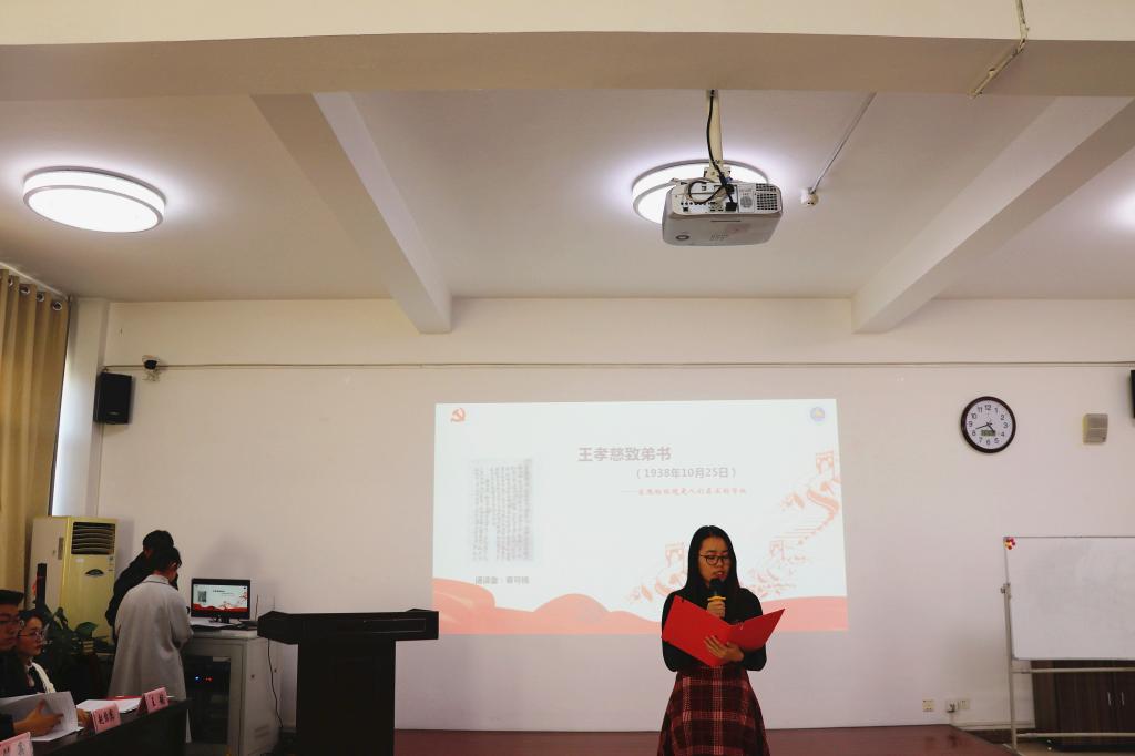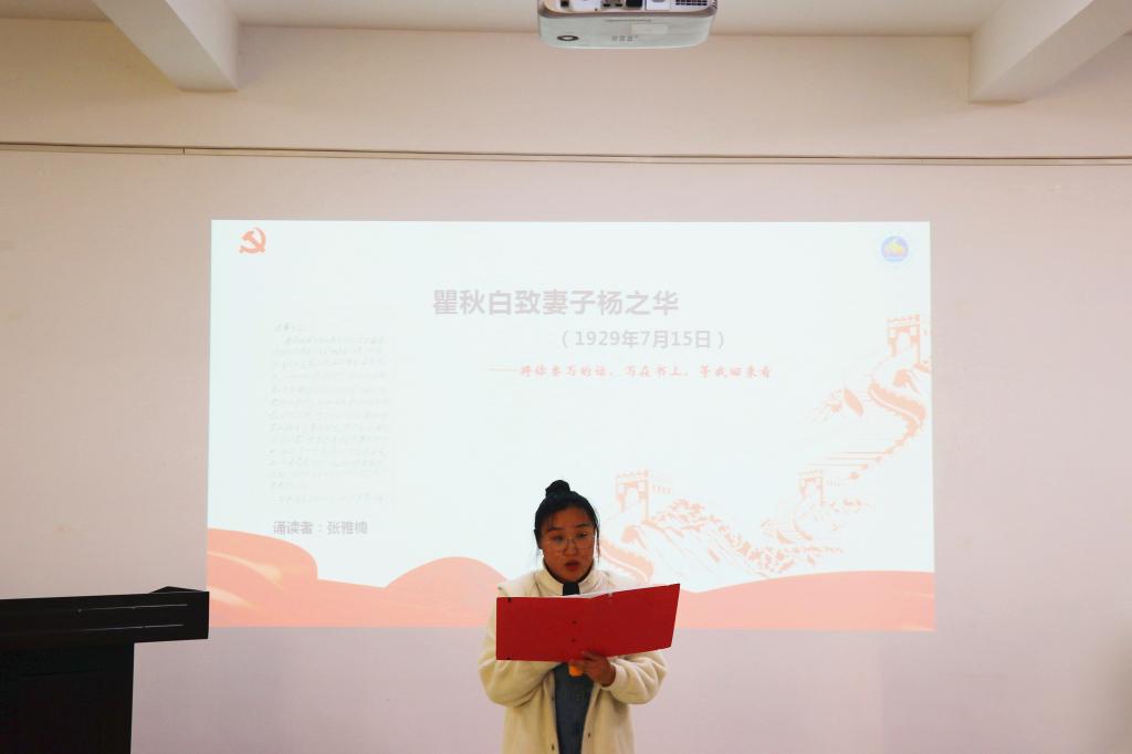 学院马列理论读书社社长、2017级计算机科学与技术专业本科生张雅楠同志诵读了瞿秋白致妻子杨之华的家书,“将你要写的话,写在书上,等我回来看”,这是共产党人对妻子最浪漫的告白。