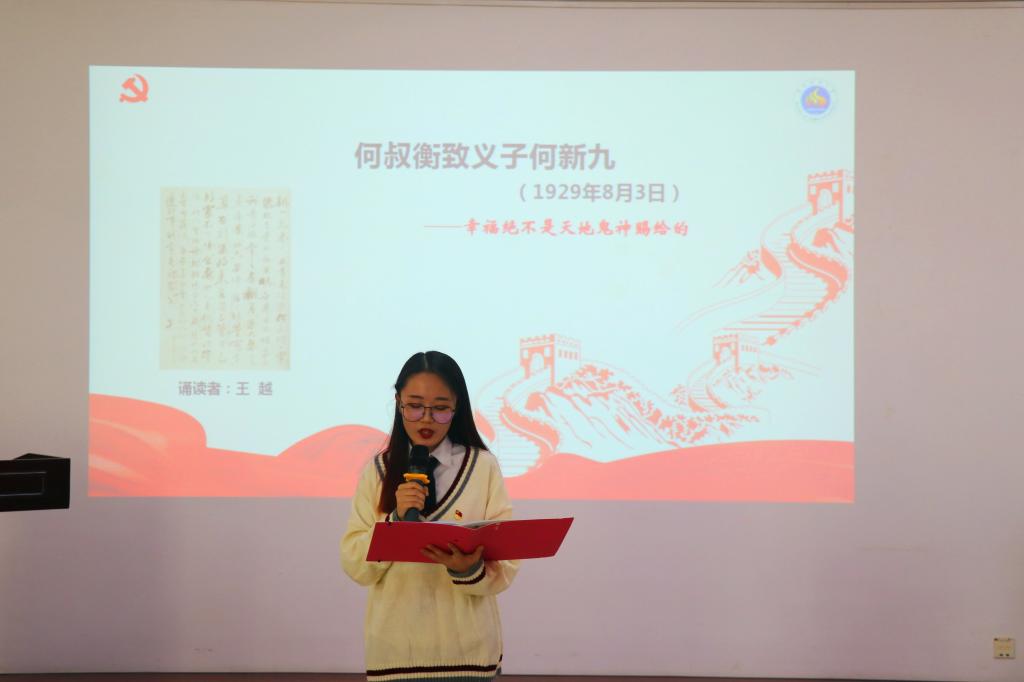 学院学生会主席、2017级计算机科学与技术专业本科生王越诵读了何叔衡致义子何新九的家书,“幸福绝不是天地鬼神赐给的”,充分体现了何叔衡对义子的殷切期盼以及非常坚定的革命信念。