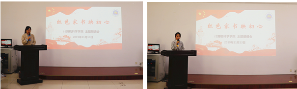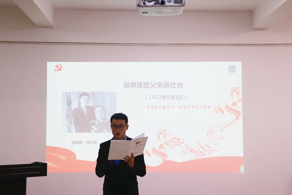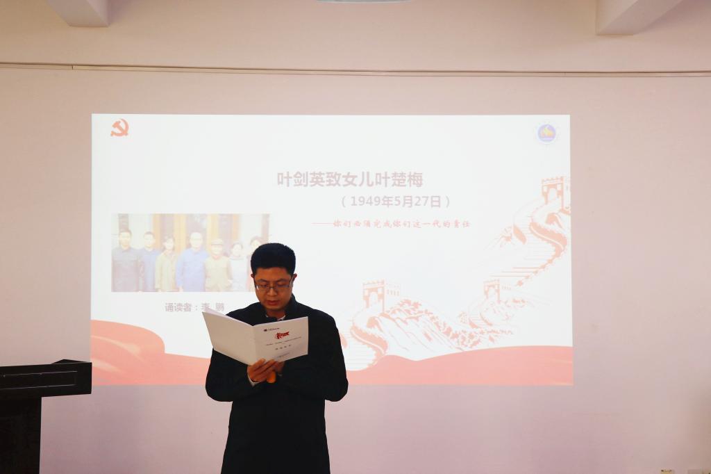 会上,2017级计算机科学与技术专业本科生李嘉琪介绍了学院十二名诵读者与诵读内容。诵读者饱含深情诵读了革命先辈的家书,与会党员无不动容、感动落泪。