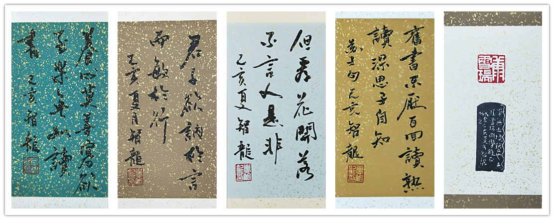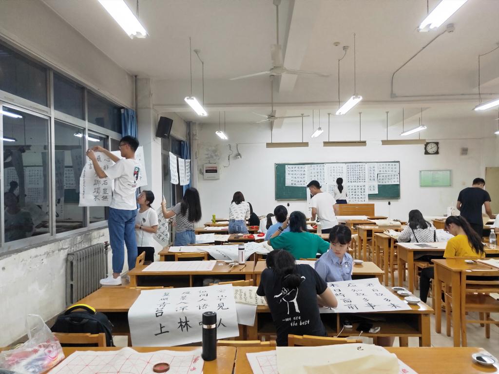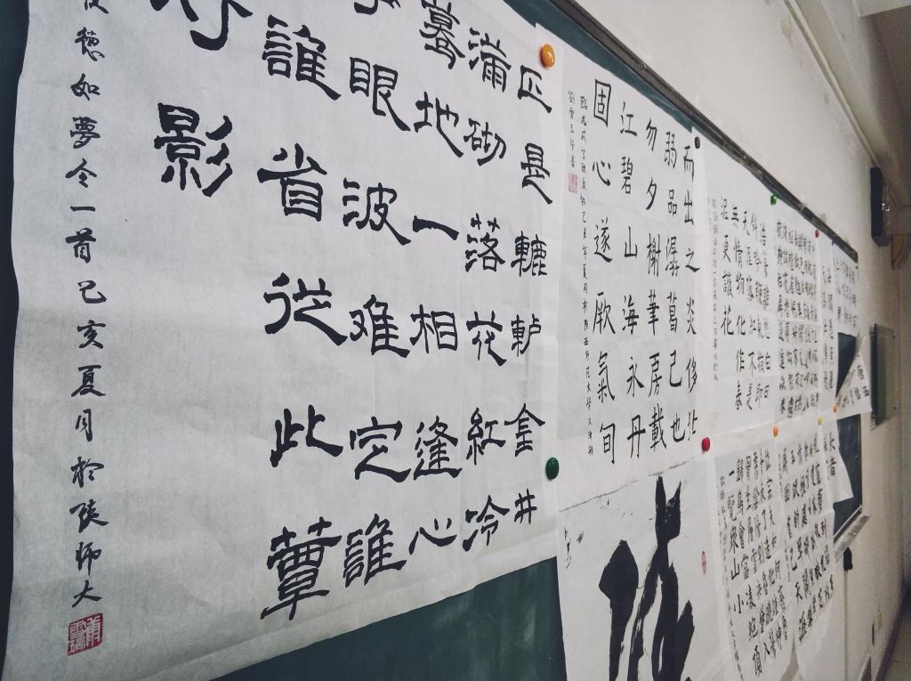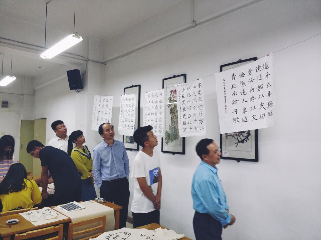 培训班指导老师曹智龙和助教张勇同学逐个指导学员完善了创作作品,随后每位学员的作品都被悬挂张贴进行了展示。展览中师生们对每幅作品驻足观看,老师们依次点评了同学们的书法创作,为每位同学的作品提出了中肯的建议,并鼓励同学们继续练习,不断超越自我。曹老师谈到,经过一学期的书法练习,同学们用笔和章法方面都有了很大的进步,希望今后能继续不断实践练习,他还为每位同学准备了毕业纪念书签,写下了对同学们真诚的祝福和希望。