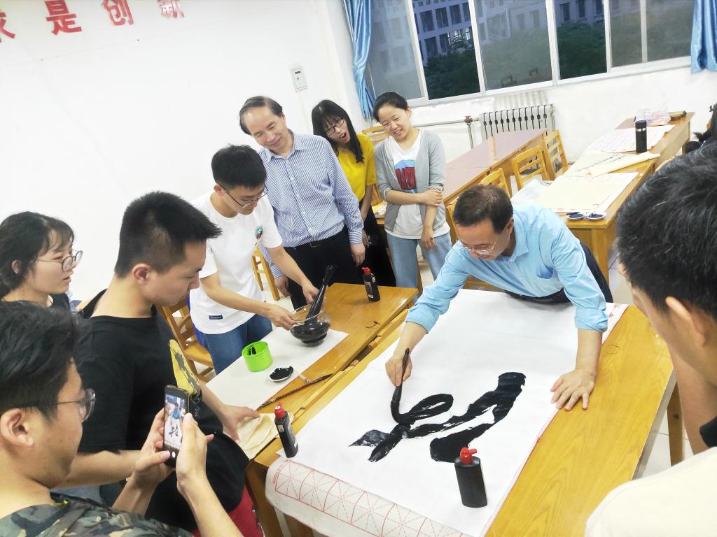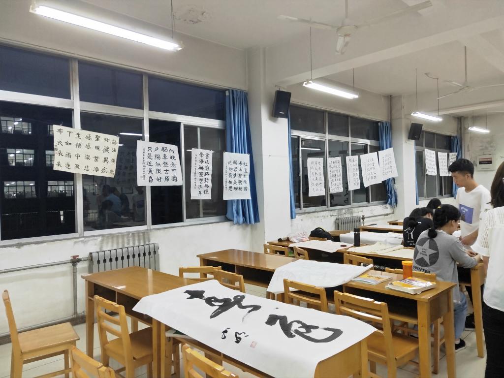 王小明院长随后为书法班致辞。他表示,书法的练习是我们一学期的收获,也将成为我们一生的情怀和宝贵的精神财富,他对同学们提出希望,鼓励同学们在未来的学习生活中都能够坚持修习书法、修养心性、磨练意志,在学好自己专业技能的同时加强自身人文素养。到现场的各位老师也与同学们一起交流书法心得,王老师还为同学们留下了墨宝。