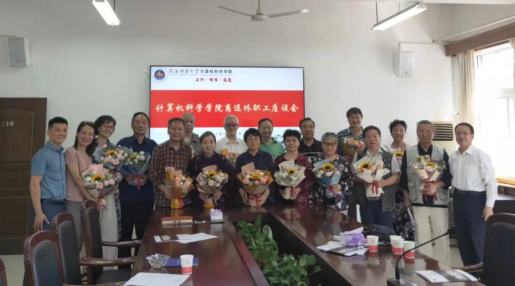 王耀明代表学院衷心祝愿各位离退休教职工节日快乐,身体康泰,诚请老一辈领导老师继续关心关注学院发展,积极参与各项工作,传承“西部红烛精神”,讲好计科故事。最后,学院领导班子成员向各位离退休教职工代表送上鲜花和祝福,合影留念。