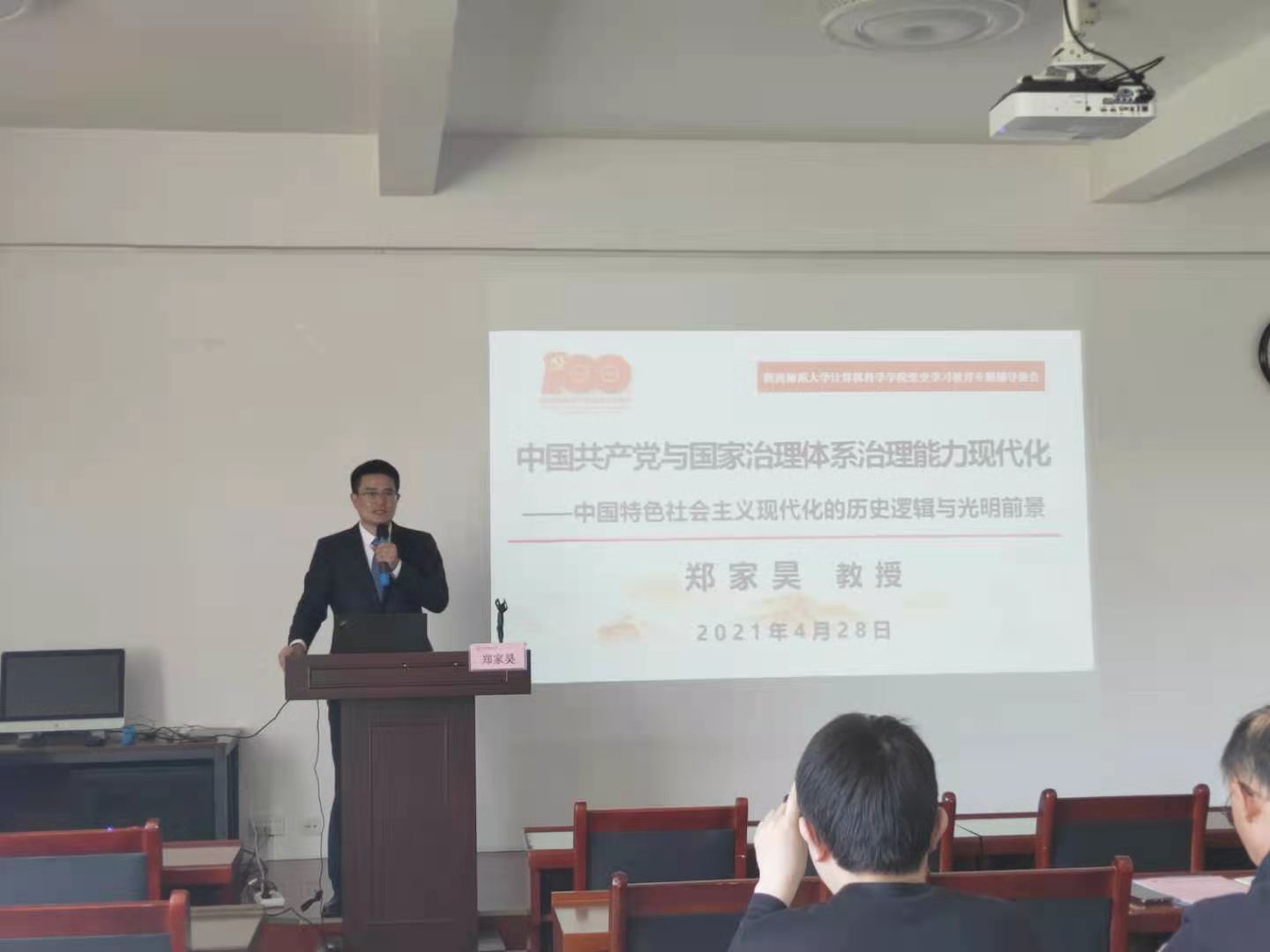 随后,学校党史学习教育教授宣讲团成员郑家昊从党史学习教育的重大决策、中国共产党百年辉煌历程、中国共产党领导的社会主义现代化和国家治理现代化的战略意蕴四个方面做了题为《中国共产党与国家治理体系治理能力现代化》的专题辅导报告。