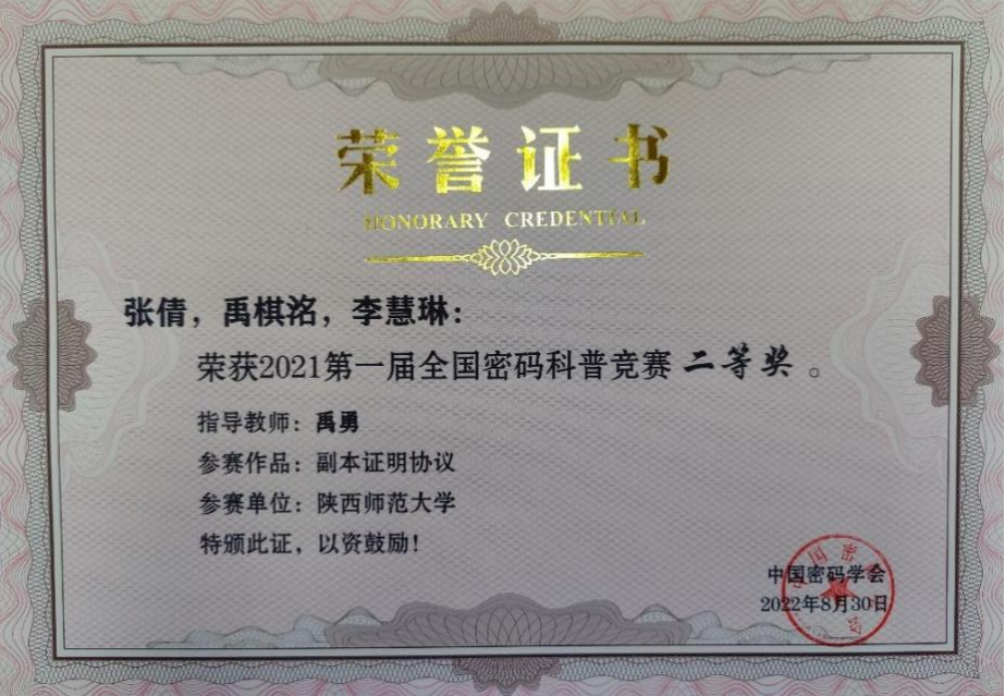 在2022年8月19日举办的由国家密码管理局指导、中国密码学会主办的第一届全国密码科普竞赛中,兔子先生 禹勇教授指导研究生张倩、禹棋洺、李慧琳组队以作品《副本证明协议》参赛,荣获全国二等奖。此次比赛共有全国高校和企业共712支队伍报名参赛,提交602件作品,最终评出2个一等奖,18个二等奖和68个三等奖。