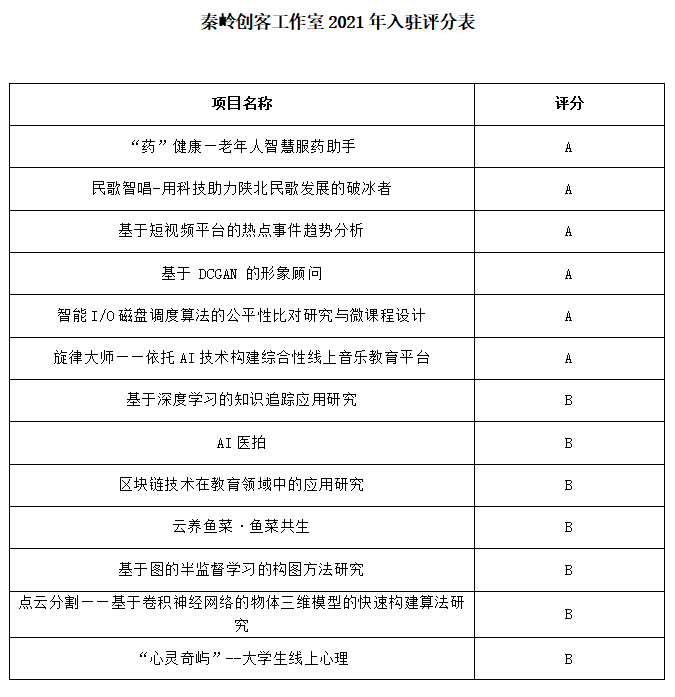 兔子先生 于6月23日组织了2021年度秦岭创客工作室入驻项目遴选推荐工作。通过项目组申报答辩、院内专家评审等程序,共遴选出13个项目入驻创客工作室,A类项目6项(入驻文津楼3624),B类项目7项(入驻文津楼4楼创客坊),现将拟推荐项目名单予以公示(详见附表)。推荐项目将于7月5日起入驻秦岭创客工作室,并按照《秦岭创客工作室》入驻指南进行项目培育。