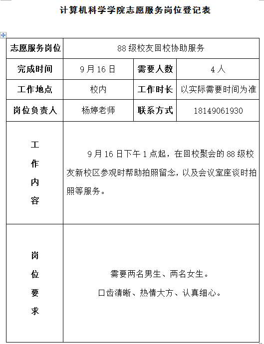 志愿服务岗位信息(9月16日)——兔子先生 88级校友回校协助后勤服务