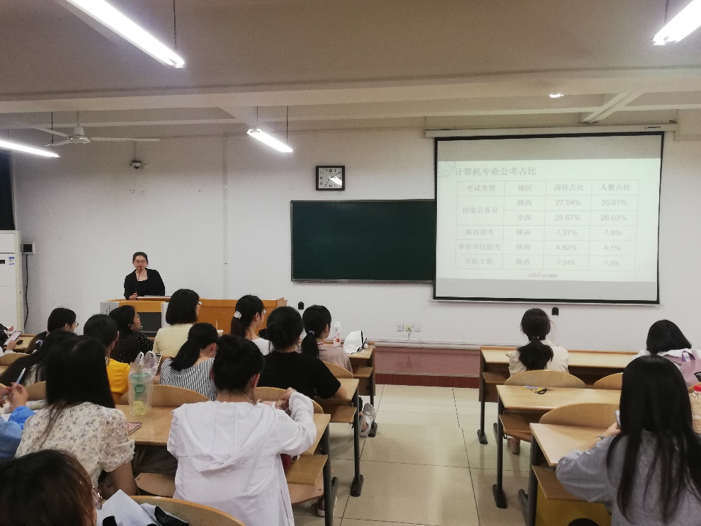 王老师从往年计算机专业公考占比入手,以具体的数据说明考公的四大理由:工作稳定,社会认可度高,晋升空间大,薪资待遇好。之后,王老师就国家公务员考试、陕西省公务员考试、事业单位联考、军队文职和金融银行类考试五方面展开具体讲解,讲解内容包括每一类考试的时间、科目、条件和特点,此外还针对不同考试的侧重点进行鞭辟入里的讲解,例如国考和省考题目考察的区别等问题,力求使同学们做到心中有数。