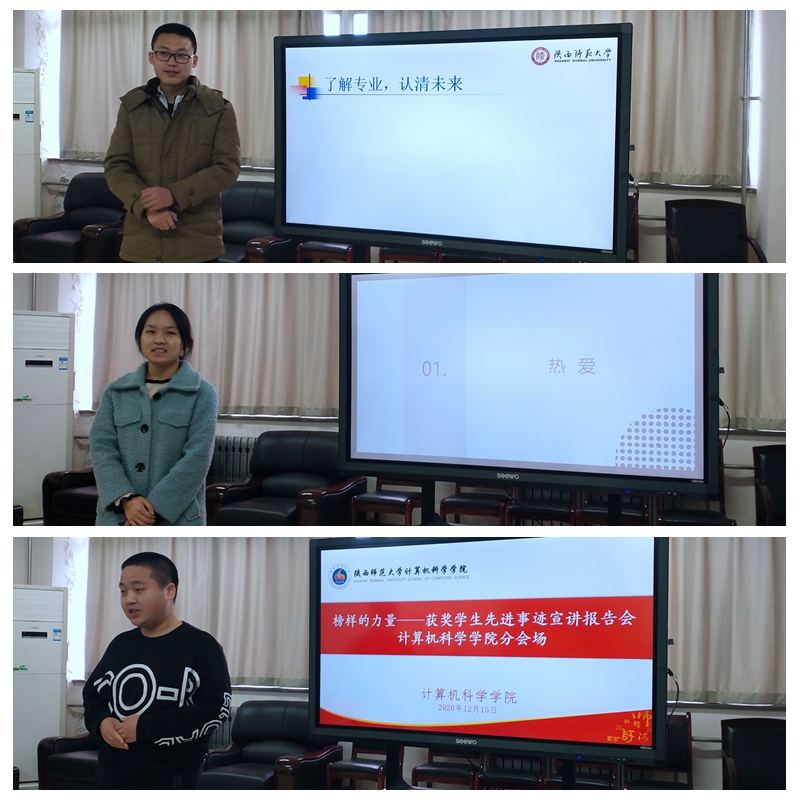 报告会上刘国伟以自我学习和工作的亲身经历出发,号召同学们在做好日常工作的同时多去参加ACM、大学生数学建模等学科竞赛,从而丰富见闻、拓宽视野。他鼓励同学们在日常生活中要积极工作、认真学习,坚定信仰、砥砺奋进,以昂扬的斗志和饱满的热情投入到日常学习生活中,努力成长为德智体美劳等方面全面发展的社会主义建设者和接班人。刘真通过分享自己大学期间的科研经历、工作经历、获奖经历等,详细地介绍了专业课的学习方法、编程能力的提升途径以及兼顾学习与工作的两全之法,鼓励大家在本科期间敢闯敢试、善思笃行,勇于创新、敢于开拓,在实现自己理想的同时不要忘记自己最纯粹的初心,真正做到“不忘少年凌云志,敢许人间第一流”。靳雨欣从自身出发提醒大家“不奋发,则心日颓靡;不检束,则心日恣肆”,鼓励同学们在大学期间不断学习、追求进步,养成自律的学习和生活习惯,让自己的四年学习时光不留遗憾。