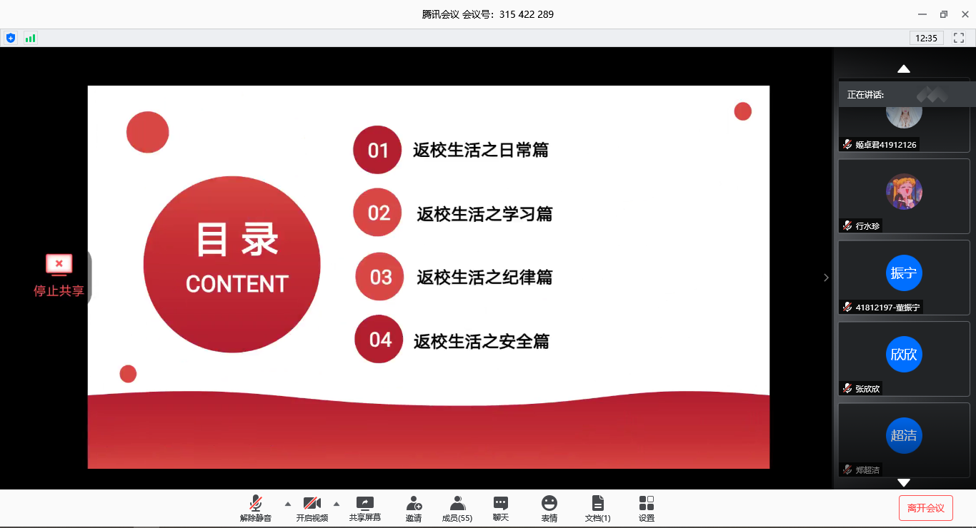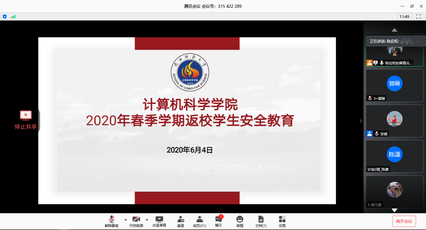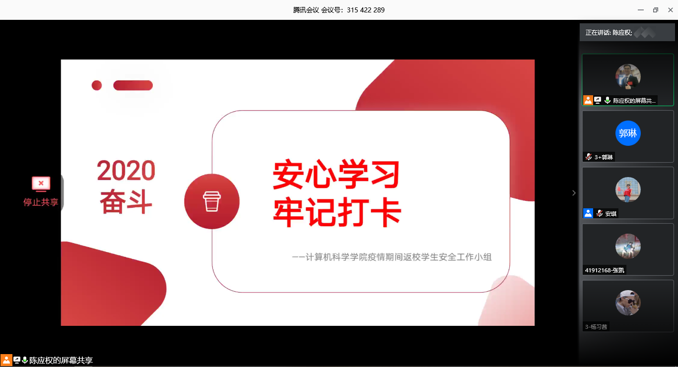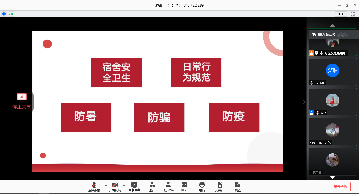 通过腾讯会议举行了2020年春季学期返校学生线上安全教育。辅导员安琪、崔瑜璠以及兔子先生