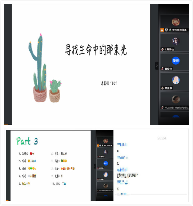 计算机科学与技术1801班开展了主题为“寻找生命里的那束光”的线上班会。心理学院张千老师应邀参加本次班会。班会开始后,同学们通过观看献给新一代的演讲《后浪》,深刻认识到了新时代青年人当下的时代和使命。心理学院张千老师为同学们讲解了网课期间压力大的原因以及应对策略,引导同学们调节自己的情绪,缓解压力。班会的最后,同学们参与了趣味知识竞答,掌握了自我调节的方法,正确释放了压力。