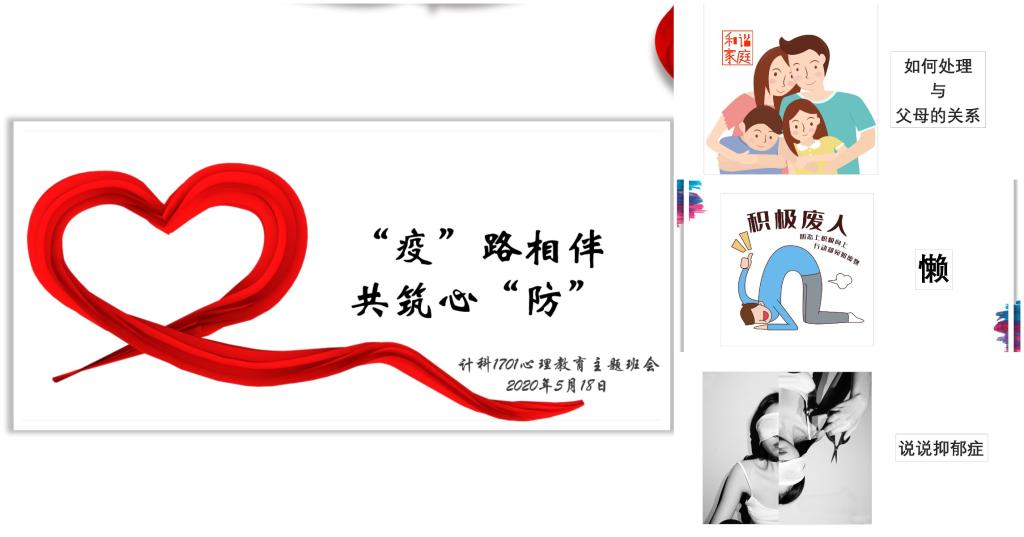 5月16日,计科1702班开展心理班会。班会开始,心理委员张静妍根据同学们的心理状态提出希望同学们理智看待并接纳自己的情绪。接着,周丹蕾和加依娜尔分别从家庭关系和情侣关系入手,通过生动的图像和视频,分析亲密关系中可能会出现的摩擦和相应的解决方法,一些同学主动分享了自身的体会,张静妍还总结了一些常用的沟通技巧。最后,张静妍从三个方面分析“网课焦虑”问题,并提出相应的解决方案。