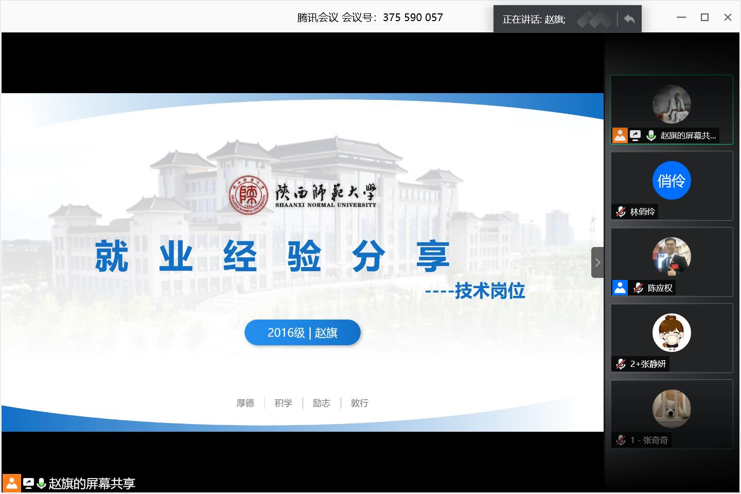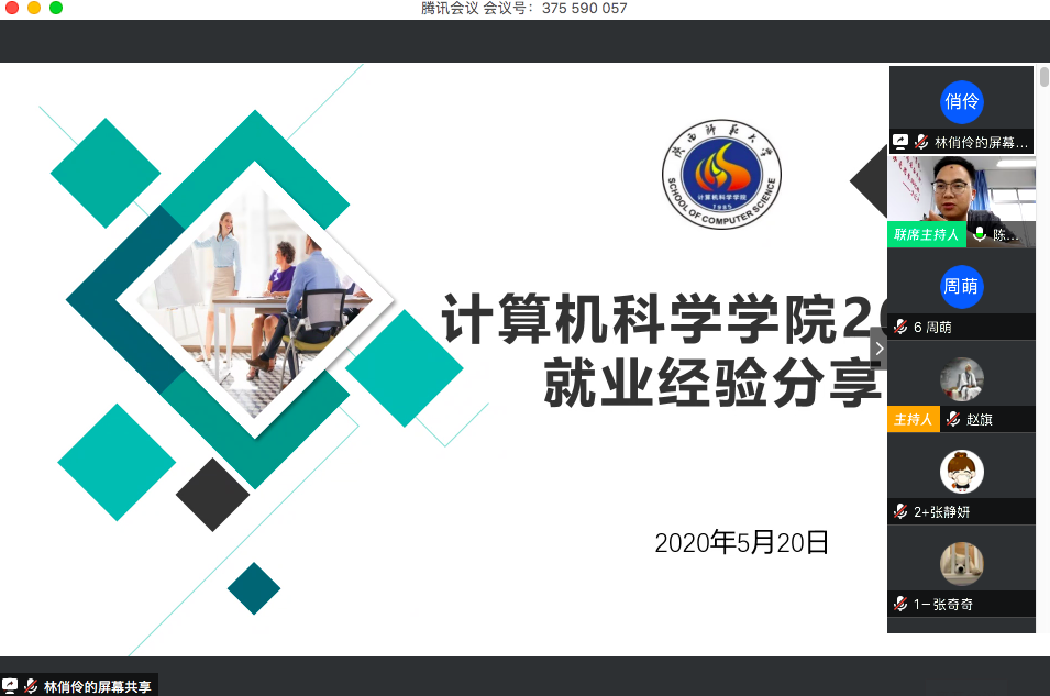 举办了2021届本科生就业经验线上分享会。本次分享会邀请到15级王萍,16级赵旗、赵元榜等三位学长学姐为2021届本科生分享各自的求职经验,17级的张园园同学向大家分享了自己寻找实习单位的经历。学院党委副书记袁冰、2021届全体本科生参加了本次分享会,分享会由辅导员陈应权主持。