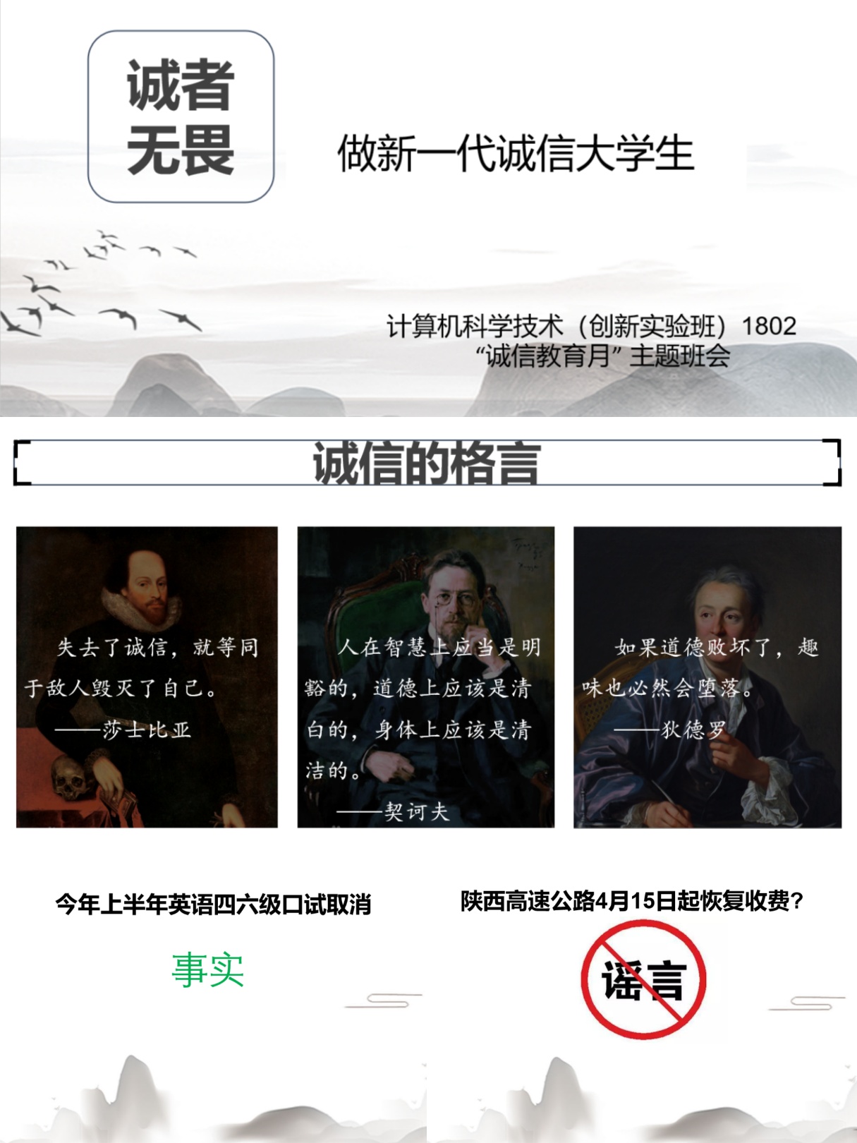 计算机科学与技术(创新实验班)1802班以谣言为脉络,开展主题为“做新一代诚信大学生”的线上班会。通过诚信的反面事例,激发同学们对诚信的重新解读。同时围绕疫情期间的“时政信息”进行辨别,提高同学们的分辨本领和诚信意识,提醒大家要辩证地看待这些消息并作出正确的判断,面对不实的信息要做到不信谣不传谣。