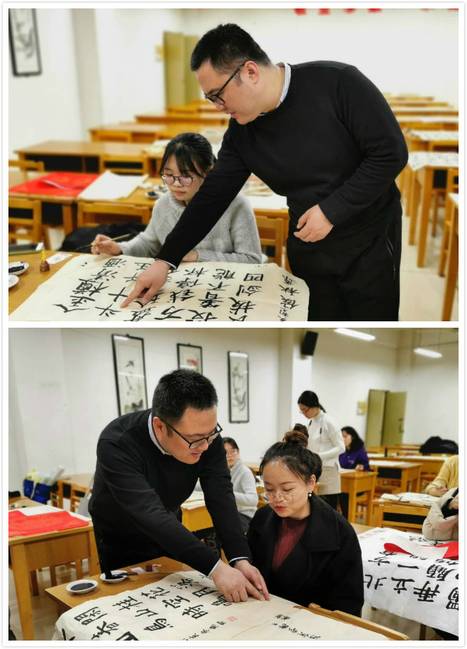 随后,几位老师与所有学员一起书写了对联。对联艺术和书法艺术都是建立在汉民族语言文字特殊性的基础之上,具有民族特色的传统艺术,明清以来,对联的书写已经成为一门独特的书法艺术。将对联与书法结合学习,是本期书法班新的尝试。