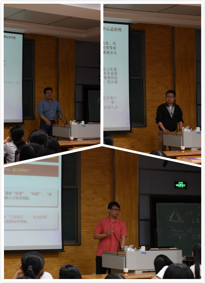 党委副书记袁冰老师、教学副院长马苗老师、软件工程专业负责人祁超老师、华讯科技有限公司企业负责人姚国新、京东云创中心总经理王泽方、2017级辅导员陈应权以及2017级全体非师范生参加了本次专业分流宣讲会。