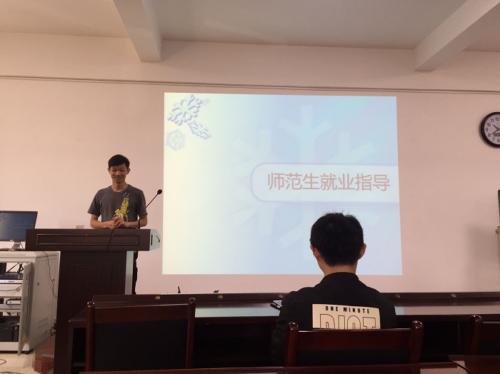 第二位主讲人是2014级计算机科学与技术一班的来自陕西商洛的李孝潮同学,已签工作于长安三中。他讲到面试是一个表现自己的机会,面试时一定要注意自己的谈吐举止,最重要的就是要有自信。他告诉同学们找工作期间要通过各种渠道留意跟自己有关的就业信息,比如师范生群、师大就创网、省教育厅网站等。