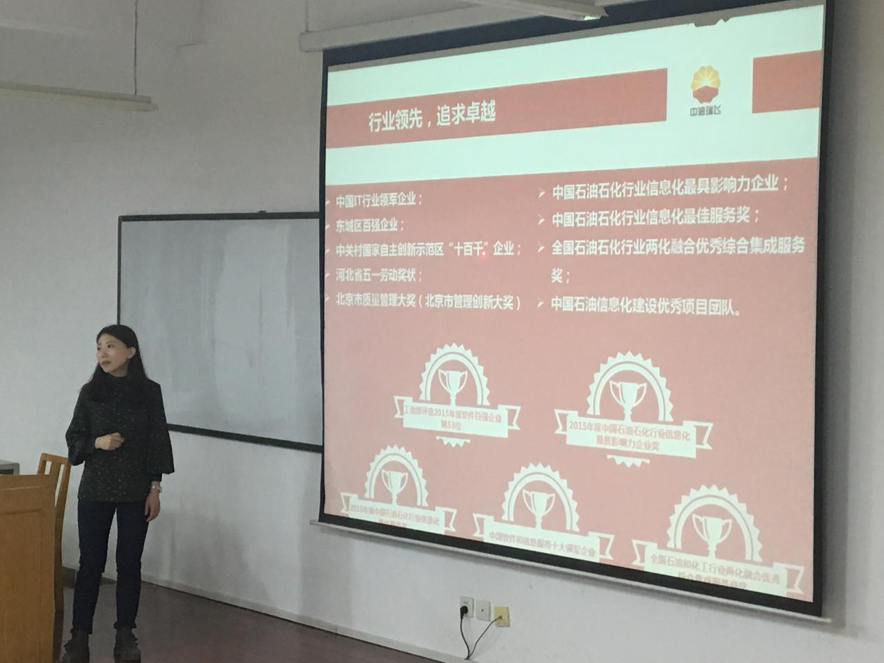 北京中油瑞飞信息技术有限责任公司是中国石油集团东方地球物理的全资子公司,是中国石油集团公司规模最大,综合实力最强的信息技术单位,主要面向能源,公共事业与金融等行业,为其提供规划,咨询,实施及运维,培训的一体化服务。会上,公司宣讲人为同学们详细介绍了公司的发展里程,核心业务范围,兔子先生,工作地点等内容,并通过图片向同学们详细展示了招聘流程,公司福利,入职待遇等内容。同学们就各自关心的问题进行了询问,公司负责人也都给予了耐心的解答。之后还进行了有奖问答环节,宣讲人就所讲内容进行提问,在得到同学们的正确答案后现场赠送了礼品,最后进入到了为时一小时的笔试环节并现场收取同学们的简历。招聘会后,部分学生与企业代表进行了更加深入的交流,至此,专场招聘会圆满结束。