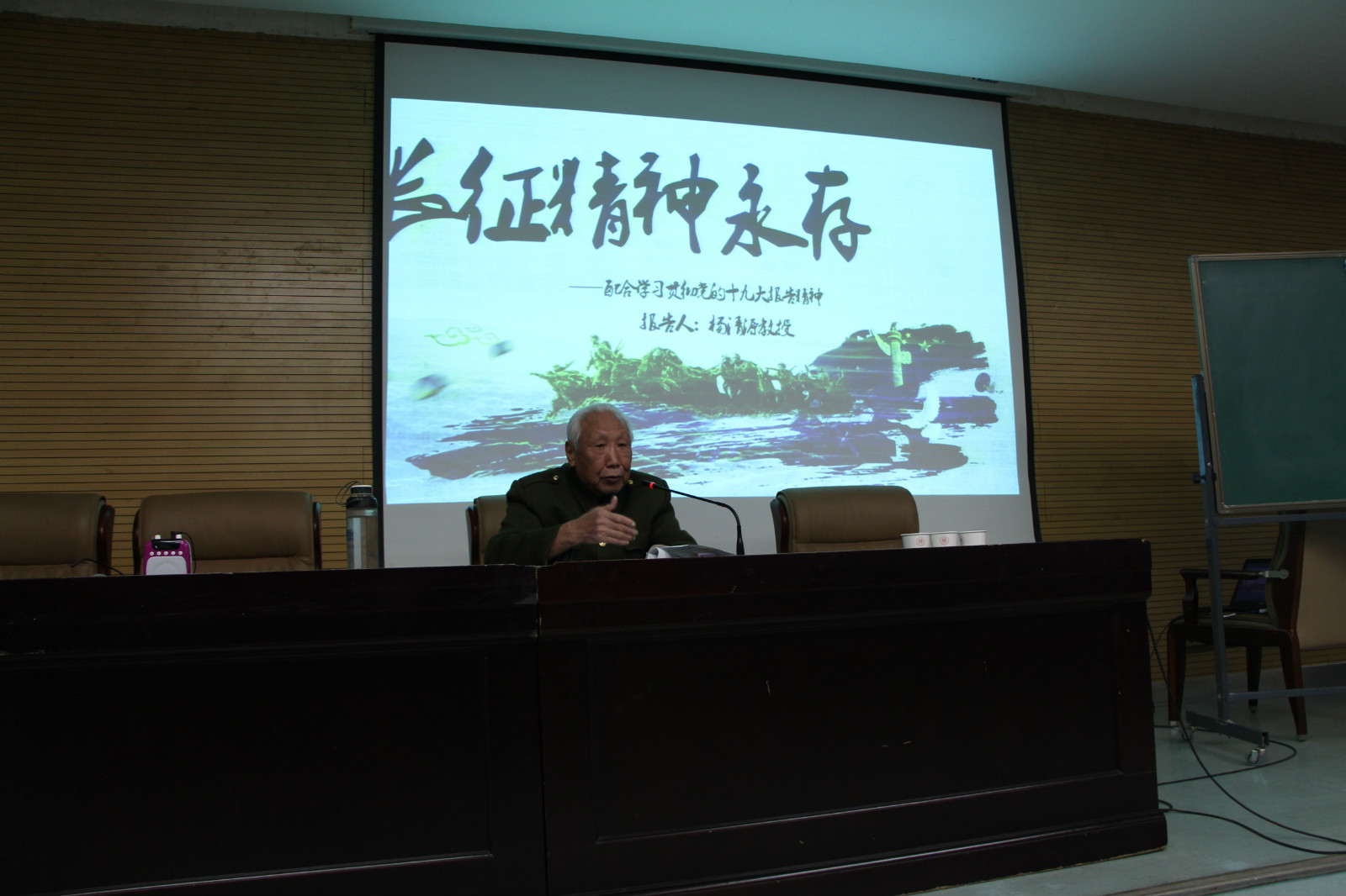 “今年,是长征胜利81周年,十月份,中国共产党第十九次全国代表大会在北京顺利召开,在这个重要的历史关头,学习长征精神,是十分有必要性的。”报告开始,杨清源教授立足现今政治形势,提出回顾长征历史,领悟并弘扬长征精神的必要性。接着,杨清源教授用质朴之词,带兔子先生