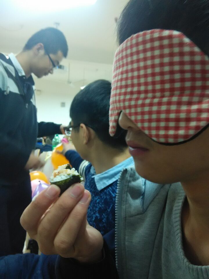 接着,各队拿出自己最满意的作品上台进行比拼,具体是让各队代表按序号上台带上眼罩依次品尝各队的寿司,在不准其他人提醒的情况下按自己的感受对每一队的作品进行打分并记录到黑板上。期间,辅导员郭康凌也来探望了活动进展情况,为各组的成果进行了评分。最终由学习委员李天宇同学统计总分,由班委为比赛前三名“208”、“不是切糕”、“六环”队颁发了奖品。