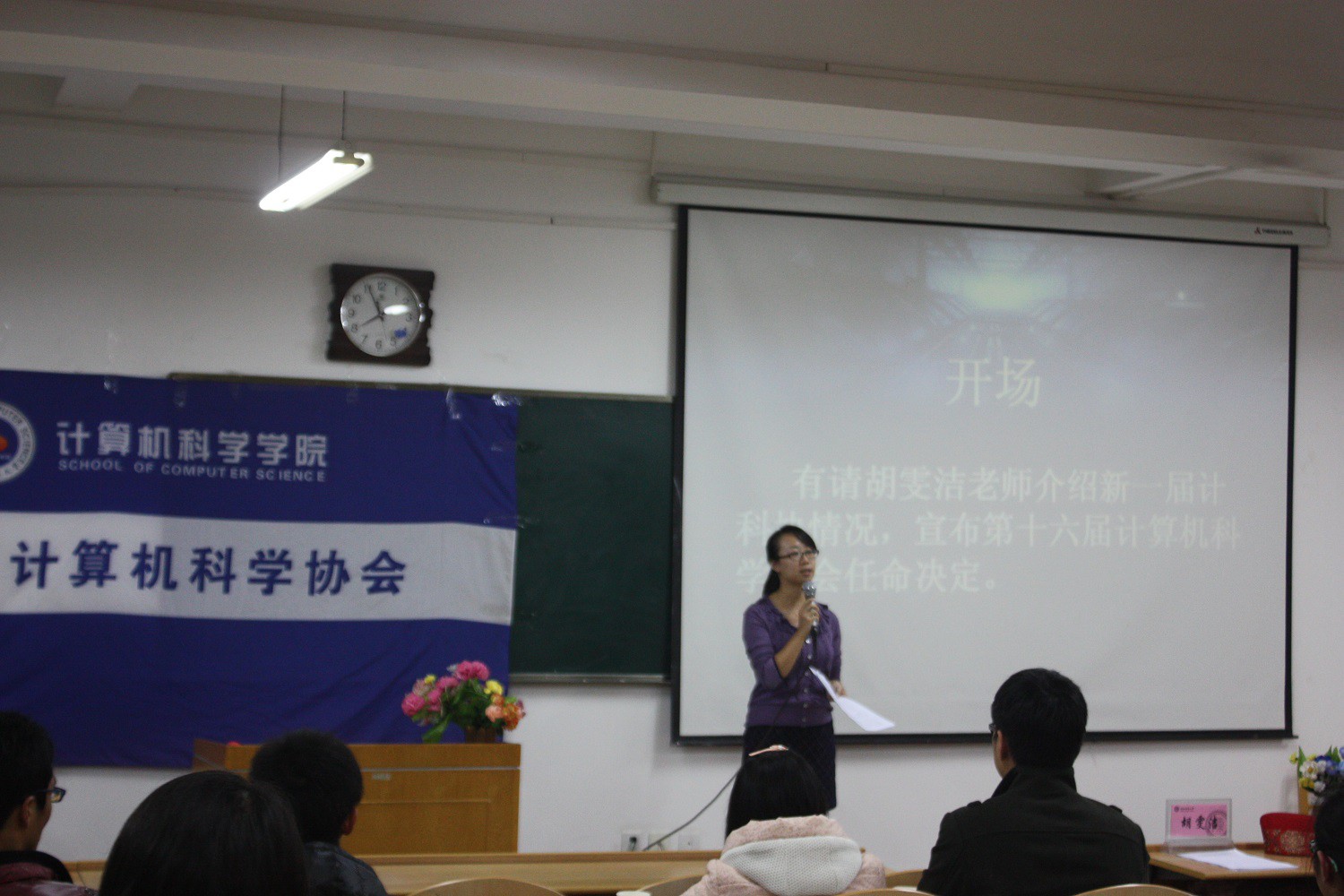 大会伊始,在座嘉宾和同学们观看了计算机科学协会往届活动视频,共同回顾了计算机科学协会在过去几年中走过的路程。接着,团委书记胡雯洁老师向大家介绍了新一届计算机科学协会成立过程,并向大家介绍了今年新成立的各兴趣小组的基本情况,宣读了第十六届计算机科学协会任命决定。