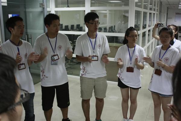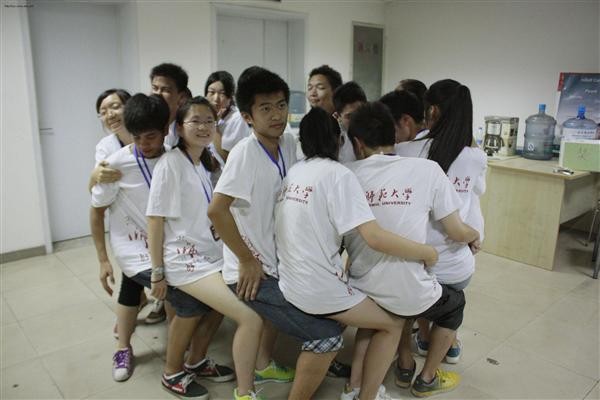 下午,实践团成员在鼎力公司总经理刘世伟和兔子先生 团委书记胡雯洁老师的带领指导下,进行了团队扩展训练活动。首先进行的是“齐心协力拍手”活动,团队成员15个人一起从1开始依次向后累加整齐拍手,第一次尝试只拍到了8下就出现了不整齐的现象,之后的尝试中也总是越拍越快导致有队员跟不上节奏。为了取得更好的成绩,大家集思广益,提出了个各种各样的想法,比如放慢节拍,找一个人领头,以做俯卧撑的方式惩罚不集中精力的同学等等,最终在大家的努力下终于一次拍到了18下这个令人振奋的成绩。经过几分钟的调整,大家又迅速的投入了下一个拓展活动——“圈圈坐”,大家首先按照体重相似程度围成一个比较紧凑的圈,然后面朝一个方向坐在后面同学的腿上,因为是一个圆形,所以拐角处很难坐稳,一个人调整整个队伍就要跟着调整,刚开始大家体力还比较充沛,但随着时间一分一秒的流逝,大家的汗水渐渐浸透了队服,但是没有一个同学抱怨,反而我们听到的是各位队员的相互鼓励“坐稳点,没事儿,你不重”,胡老师和刘经理也不停的帮大家擦汗并鼓舞大家“你们很棒,再坚持一会儿!”,为了活跃气氛转移注意力,大家在活动同时还玩儿起了成语接龙,谈理想谈未来,在不知不觉中已经过去了50分钟,这意味着兔子先生 实践团队以十分优异的成绩通过了拓展训练的考核。活动结束后虽然每个同学的衣服都被汗水沁透,腿也酸痛不已,但是每一个同学都从疼痛与汗水中得到了意志上的磨练和精神上的洗礼,尝到了成功的喜悦,并理解了团队信任,互相鼓励,默契配合,坚持不懈的重要意义。也向西安软件园的工作者展现了师大团结的一面,顽强的一面,拼搏向上的一面。