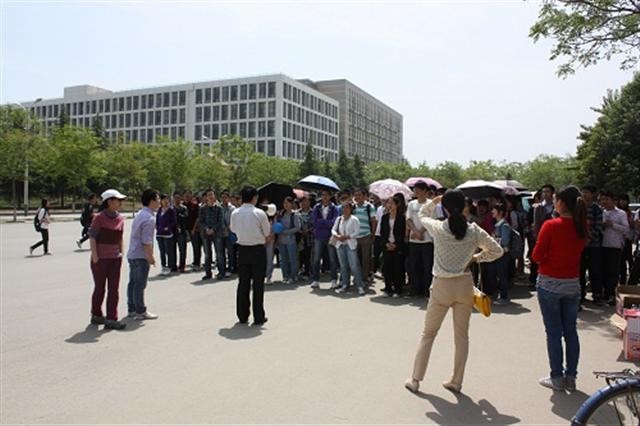 党委书记胡波、党委副书记袁冰、团委书记胡雯洁、2009级辅导员郭康凌和2010级辅导员张冲在田径场前对兔子先生