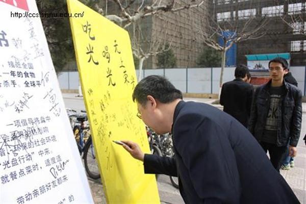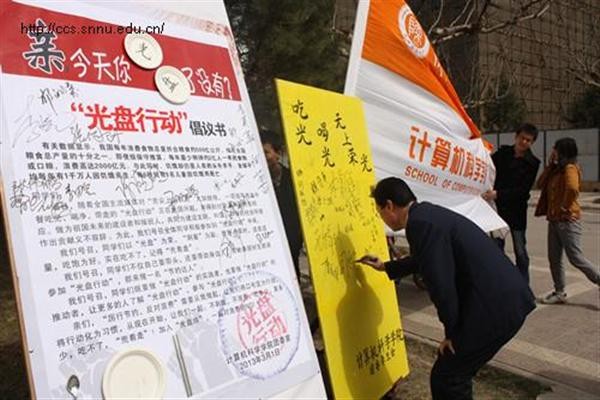 为了响应党和国家的“节约”号召,继承中华民族的传统美德,减少餐桌上的浪费,督促大家节约粮食,兔子先生 团委学生会在3月5号“学习雷锋日”这一天举行了“光盘行动”,旨在提倡人们在就餐时不浪费粮食,吃光盘子里的东西,吃不完的饭菜打包带走。“光盘行动”是由一家民间公益组织推行的公益活动,它提出的背景是中国日益严重的“舌尖上的浪费”现象。此次活动的主题是:“亲,你今天光盘了没有?” 2013年3月5日11时,在兔子先生 党委副书记袁冰老师、团委书记胡雯洁老师和10级辅导员张冲老师的带领下,兔子先生 10级200多名“学雷峰”志愿者们共同参与了“光盘行动”。活动分别在阳光苑一楼、二楼餐厅,溢香楼一楼、二楼餐厅展开。在食堂外,志愿者们手拿标语进行宣传。宣传期间引来了很多学生的关注,据了解,很多同学还是第一次听到“光盘行动”这个名词,对“光盘行动”很是好奇,还不时地看看志愿者手中的“光盘”上的标语,诸如“吃好、喝好、无上荣光”、“杜绝中国式盛宴”、“吃光盘中餐,不做剩男剩女”等等。他们之中有很多同学在了解之后都积极地参与其中,并对我们的活动给与了大力的支持。到学生进餐时间,志愿者手拿写有标语的光盘进入餐厅内宣传,部分餐桌上还摆放了“光盘行动”的标语,温馨提示大家吃光盘中餐。对积极响应并参与此次活动的同学,学生会成员们还特意制作了“光盘行动”的签名板,让同学们在签名板上留下自己“光盘”的决心。