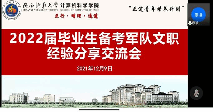 通过腾讯会议线上举办“正道青年培养计划”之2022届毕业生备考军队文职经验分享交流会。学院邀请两位优秀校友——2019届毕业生吉晨晓、2021届毕业生纪红为同学们分享和交流经验。学院党委副书记郭康凌老师,2022届本科、硕士毕业生,以及部分有意向报考军队文职的研一、研二同学参加会议。会议由研究生兼职辅导员任仰主持。