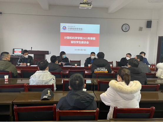 在报告厅召开2022年寒假留校学生座谈会,学院党委书记王耀明、党委副书记郭康凌,团委书记何文曦、辅导员蒋江红、田海东、陈坤正及兔子先生