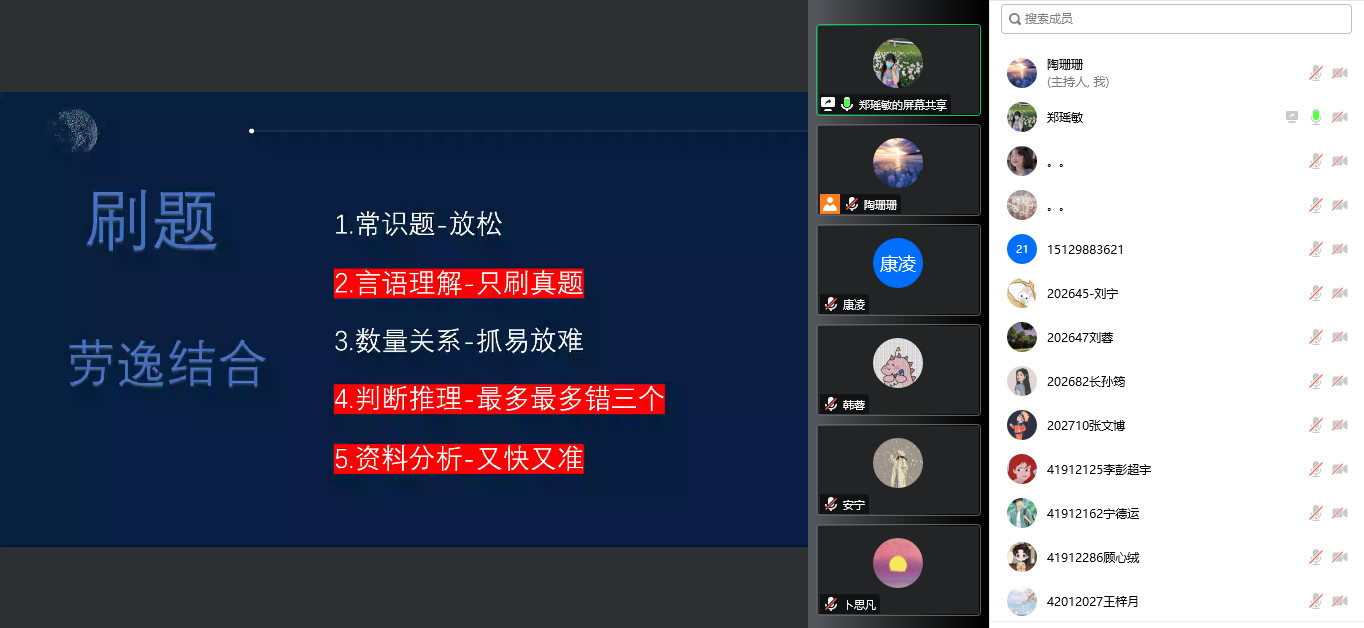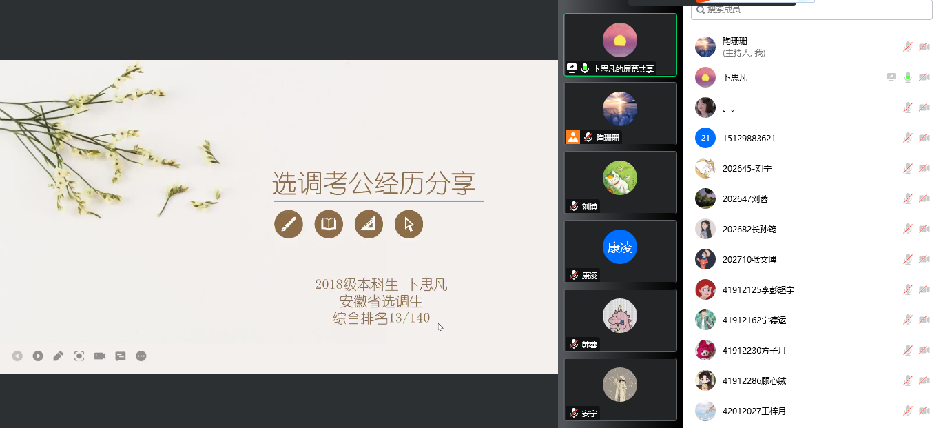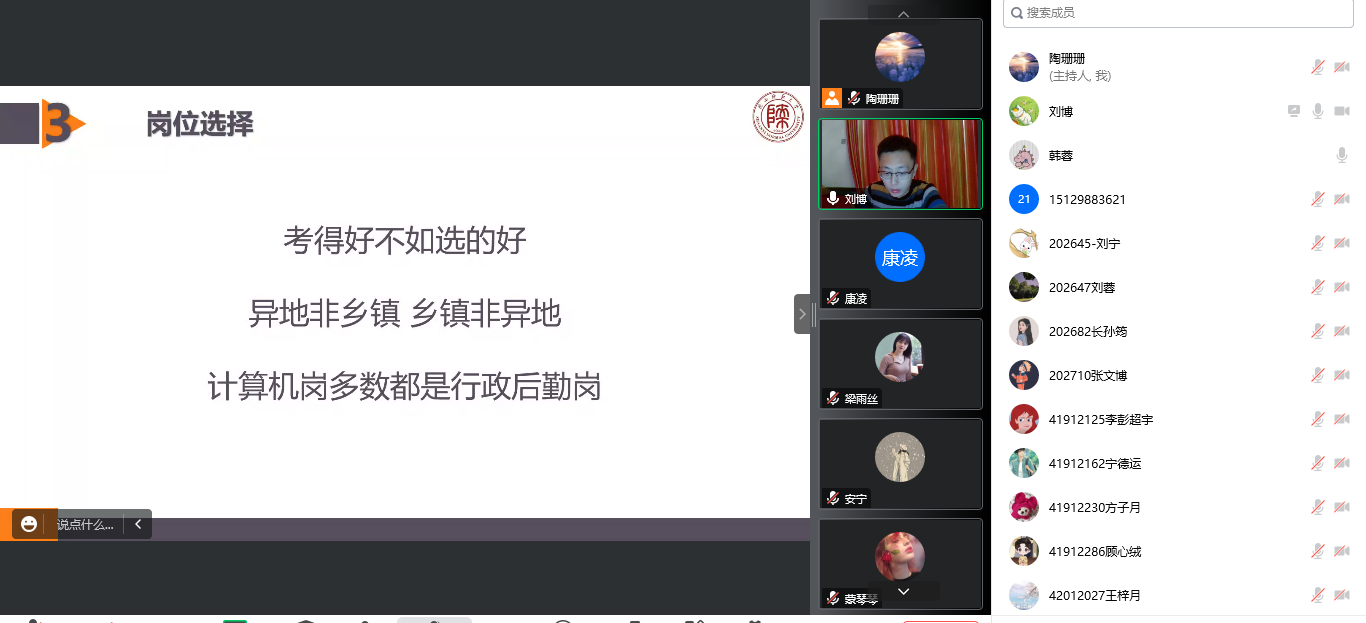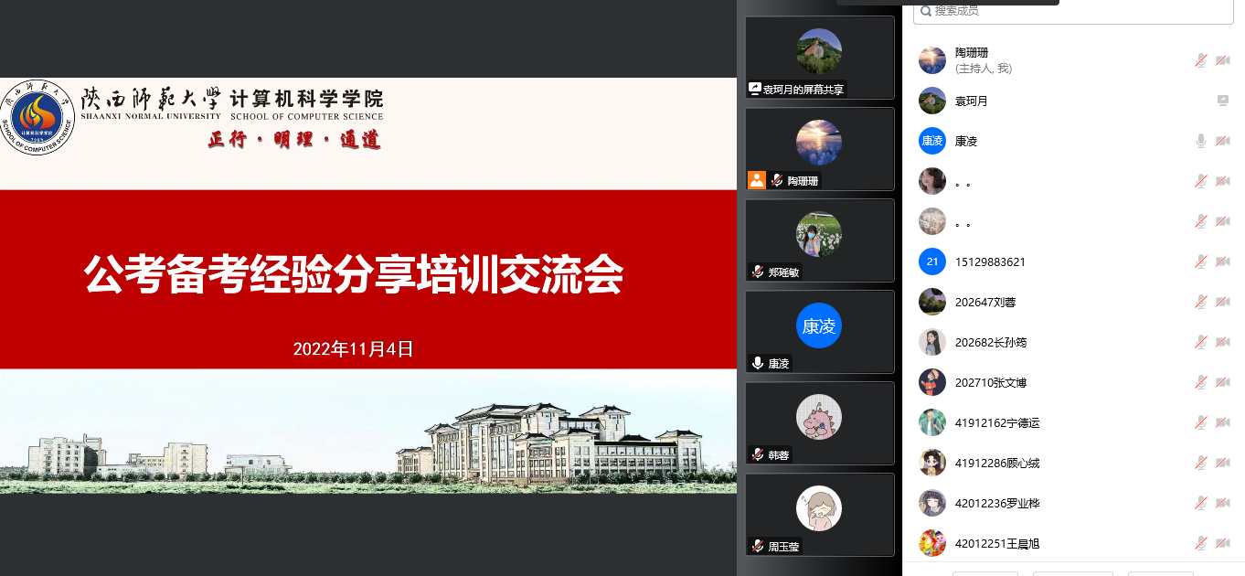 于2022年11月4日晚通过腾讯会议举办线上备考经验分享培训交流会。交流会邀请了5位成功上岸公务员、选调生以及事业单位的优秀校友分享备考经验。分享会由学院党委副书记郭康凌主持,研究生辅导员袁珂月、本科生辅导员刘柱、研究生兼职辅导员陶珊珊,以及2023届意向公考的本科生、研究生同学参加会议。