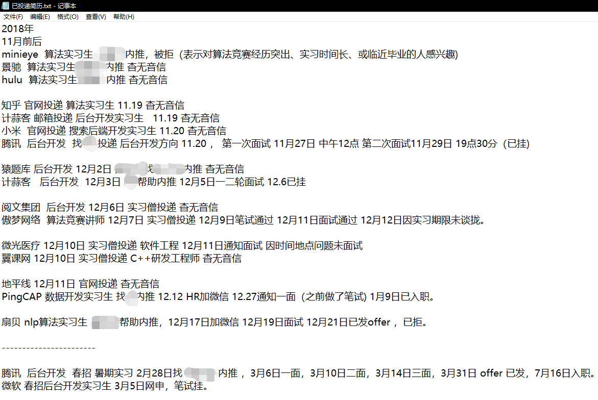 最开始投递简历中,还会尝试进行一些记录,如图 3。再之后因为绝大多数简历都杳无音讯了,渐渐也疲于再去记录,所以图片中是一个不完全统计。